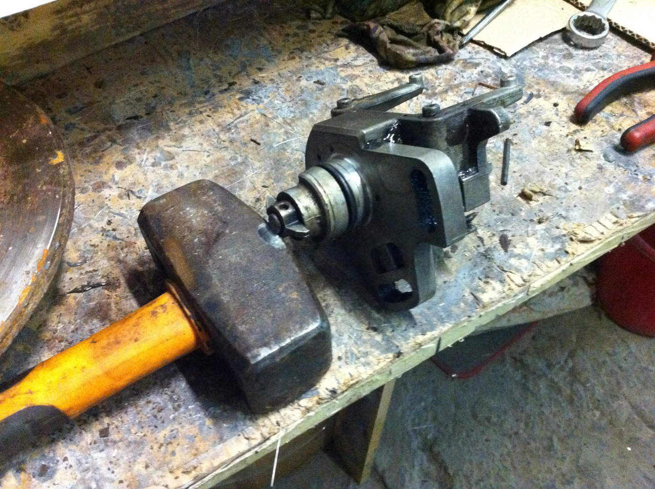 А дальше самое интересное — выбить штифт из вала, который держит бобышку. Начитавшись что делать это надо аккуратно, точнул кувалду для установки вала не неё, что бы не бить по бобышке. Кстати перед этой процедурой сделал отметку как стояла бобышка, хотя это, возможно и не важно.