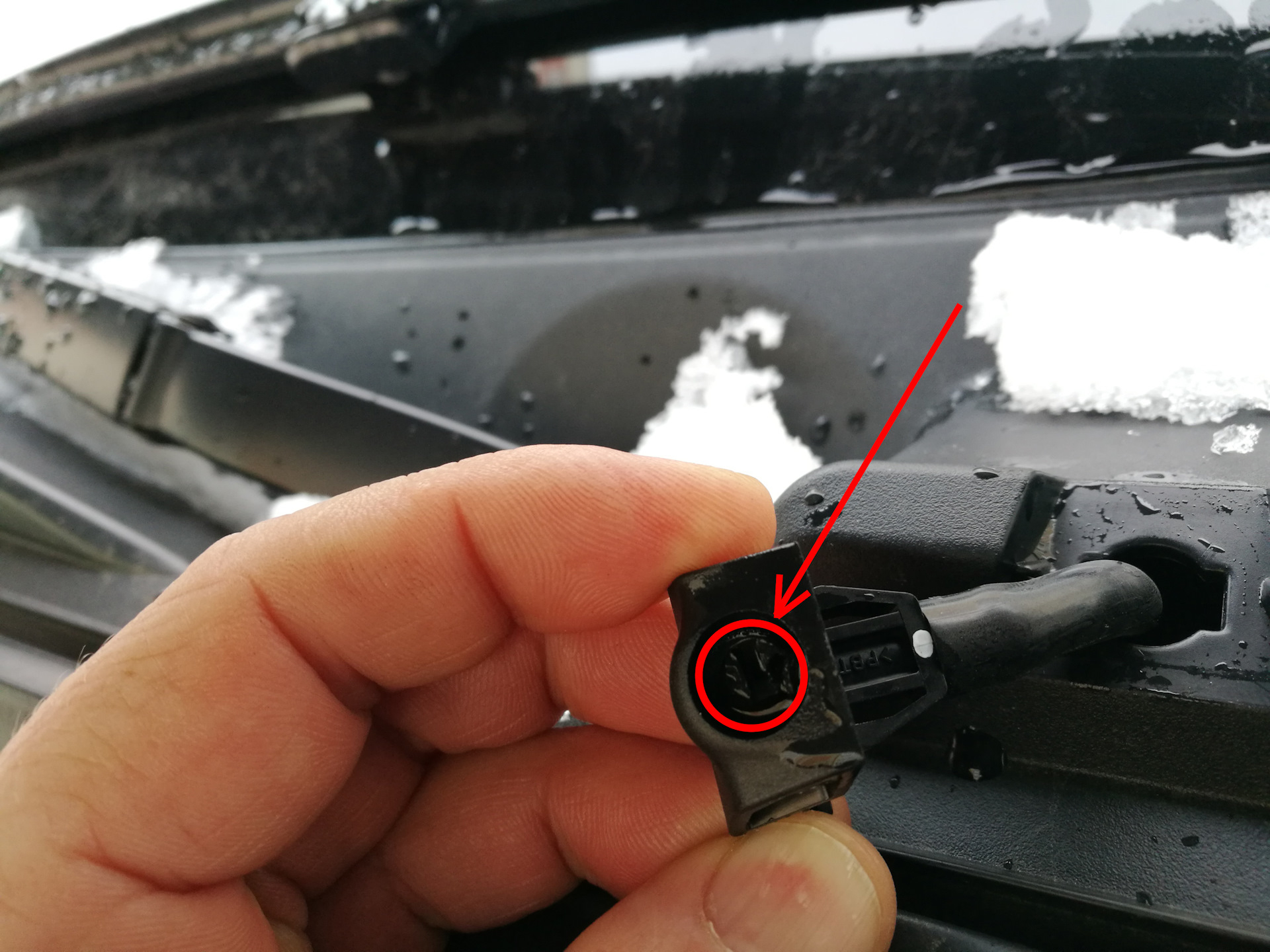 По результатам первой поездки, после получения машины у автодиллера, обнаружил, что левая форсунка брызгает ниже чем правая. При обращении в сервис, мне пояснили, что форсунки веерные, не регулируемые и в связи с тем, что изначально залита оригинальная жидкость омывателя, предложили ее заменить на более жидкую продаваемую вдоль дорог. С учетом того, что уличная жидкость вредная и замерзает при -10, то очень хорошая рекомендация! Однако, жидкость я поменял, но проблема не ушла! Пытливость русской души, заставила искать пути. Мониторинг интернета указал на возможность использования форсунок от енота и кашкая, оказалось на екзисте есть даже в продаже ключ для регулировки форсунок (около 500-700 руб.). А в итоге мою проблему решила простая отвертка, с помощью которой я смог повернуть форсунку на 180 градусов (веерность заменилась на струйность), вернул обратно на веерность. Вставив отвертку в места указанные стрелкой и немного ее наклонив, форсунка спокойно поддалась и меняла положения согласно угла нажима (в советских форсунках мы тоже самое делали иголкой) но здесь приходится подковыривать! Ключом с екзиста было бы удобнее переворачивать и наклонять форсунку без риска ее повредить! Все настроил, все работает, пищу от восторга и в шоке от наших автодиллеров!