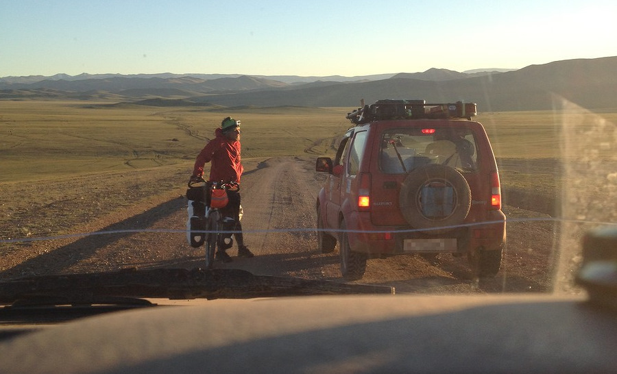 И вот, мы уже начали спуск вниз, как навстречу нам попадается сумасшедший велосипедист. Он прёт в перевал на велике, а мы ему приветственно машем руками. А за ним второй, но уже спешившись. Мы останавливаемся и на фразу "Hello", он отвечает "Привет Новосибирск!". Оказывается эти двое из Москвы. Первый выехал на велике еще на майских праздниках из Москвы, а второй присоединился к нему на Алтае (толи в Барнауле, толи в Бийске). Ехали они в Пекин, через Монголию с заездом на Байкал. Меня всегда интересовало, как такие туристы преодолевают перевалы — вверх ехать сдохнешь, а вниз — тормоза сотрешь или перегреешь нафиг.