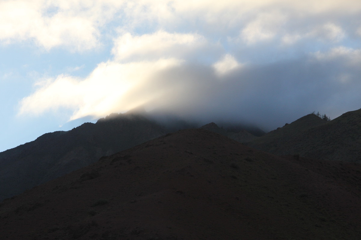 Пообщавшись и обменявшись информацией, мы продолжили движение. Нам предстоял еще один перевал и поиск базы, про которую нам сообщил наш соотечественник. Солнце же неумолимо закатывалось за горизонт. Мы спустились в покрытую тенью долину и только верхушки гор были освещены оранжевым светом. Второй перевал в своей вершине был довольно крут и это было первое место, где Джиму на первой понижайке ехалось тяжело. Мы заползи первые, а за нами Ира с Ваней и с круглыми глазами — им тоже понравился этот подъем.