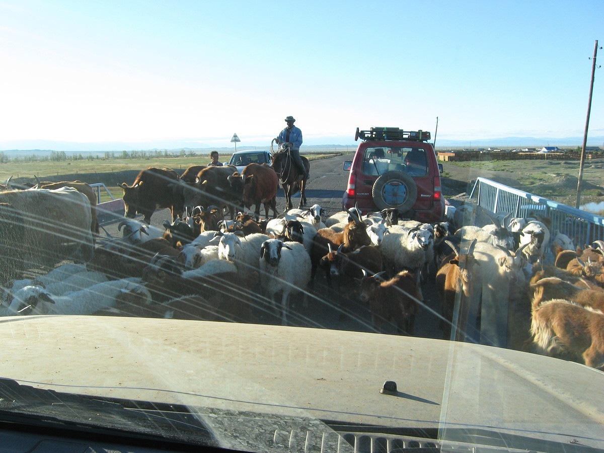 На выезде из города с нас впервые за всё путешествие взяли дорожный налог в 1000 тугриков (30 рублей). Ну и конечно же мы сразу попали в баранью пробку.