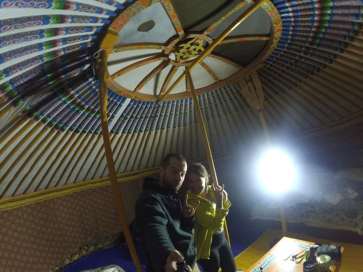 Мы продолжили движение в сторону озера по дороге. Скорость была совсем небольшая, около 20 км/ч, чтобы не словить большой булыжник в колесо. Местность после перевала стала очень каменистой. Лишь благодаря зорким глазам и зареву, оставшемуся от заката, в нужном направлении, мы заметили черные силуэты домиков в отражении неба на водной глади. Подъехав к базе мы сняли юрту и поужинали. Небо было шикарным, полным звезд и залитое млечным путём. Так как, в отличии от домиков, юрта была без отопления, то мы с Ю взяли с собой спальники и переоделись в термуху. Так мы и задрыхли внутри спальников, поверх кровати :)