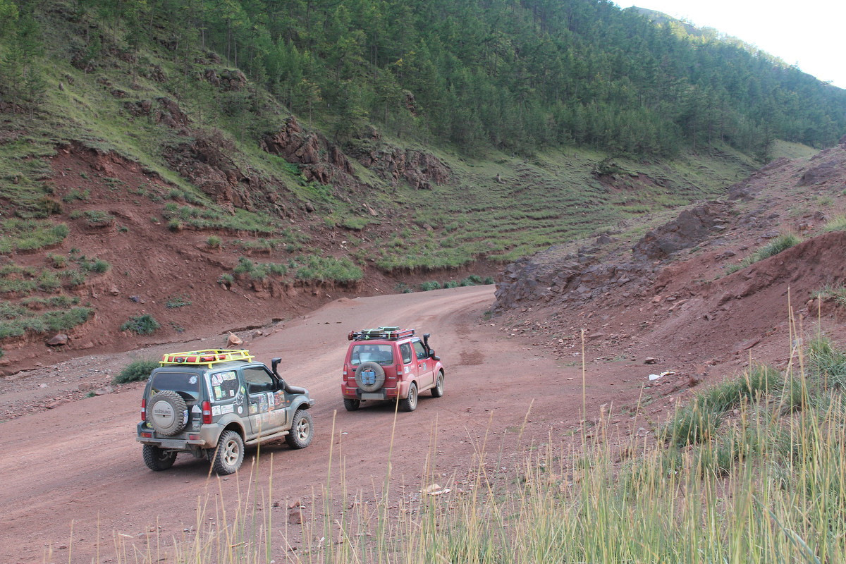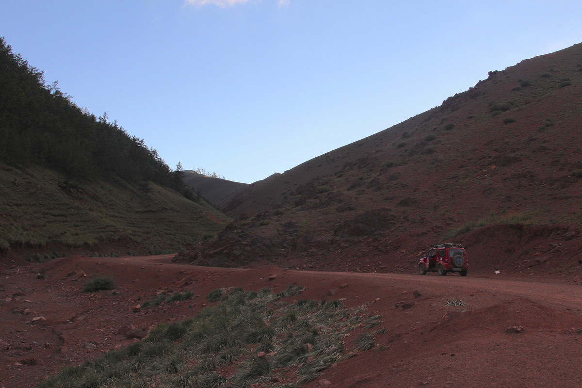 Перевал Улаан Даваа довольно красив. Дорога практически не петляет, но на склонах растут лиственницы, а почва кирпично-красного цвета.
