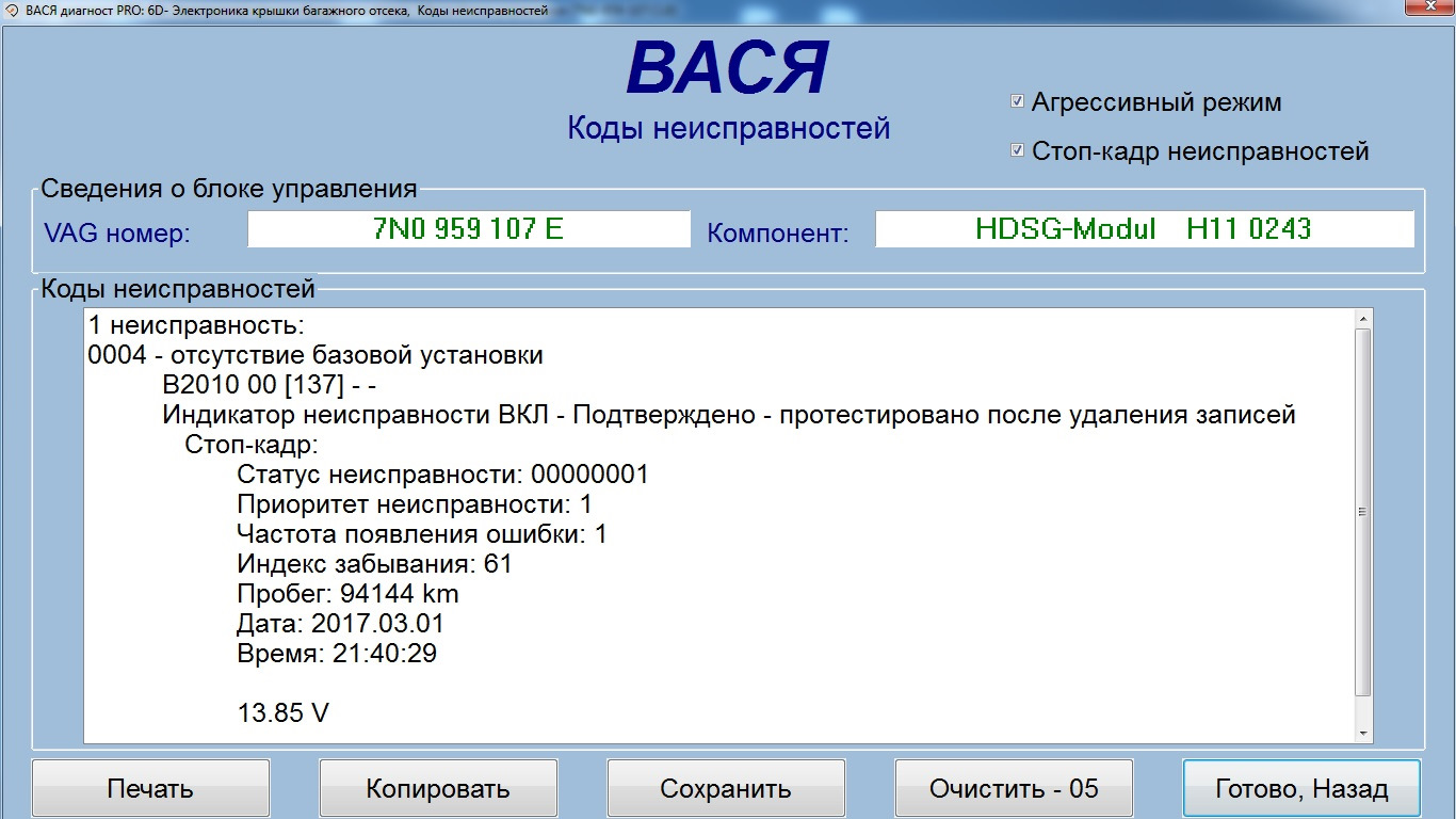 Подключили Васю диагноста. В памяти оставались старые ошибки по приводам двери багажника, плюс появились ошибки по каким-то там блокам (возможно, в связи с отсутствием предохранителя в схеме, возможно, с установкой не знакомых блоку упоров).