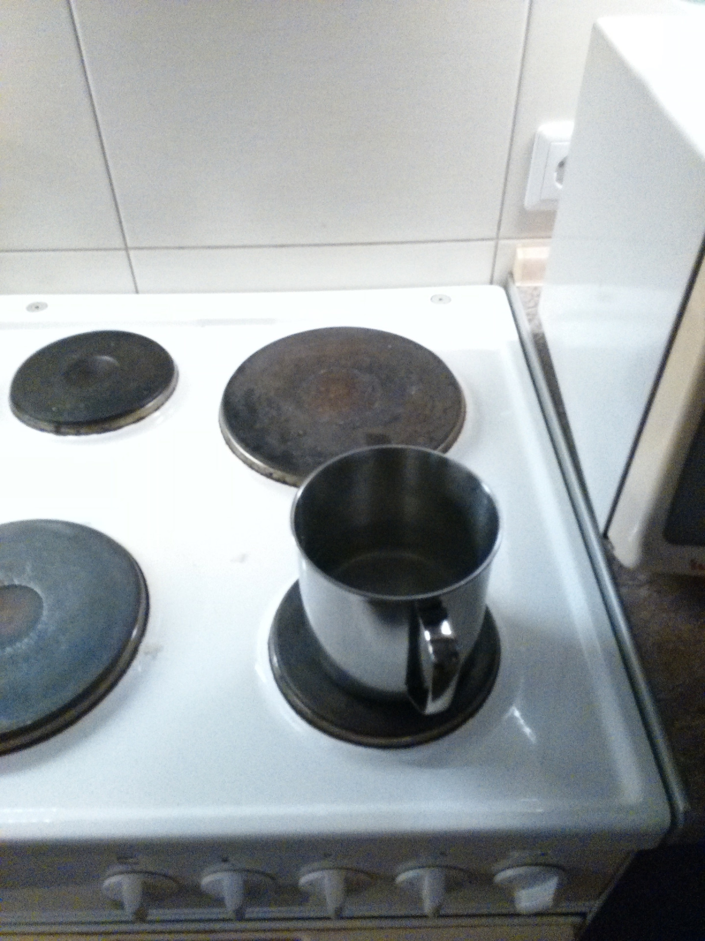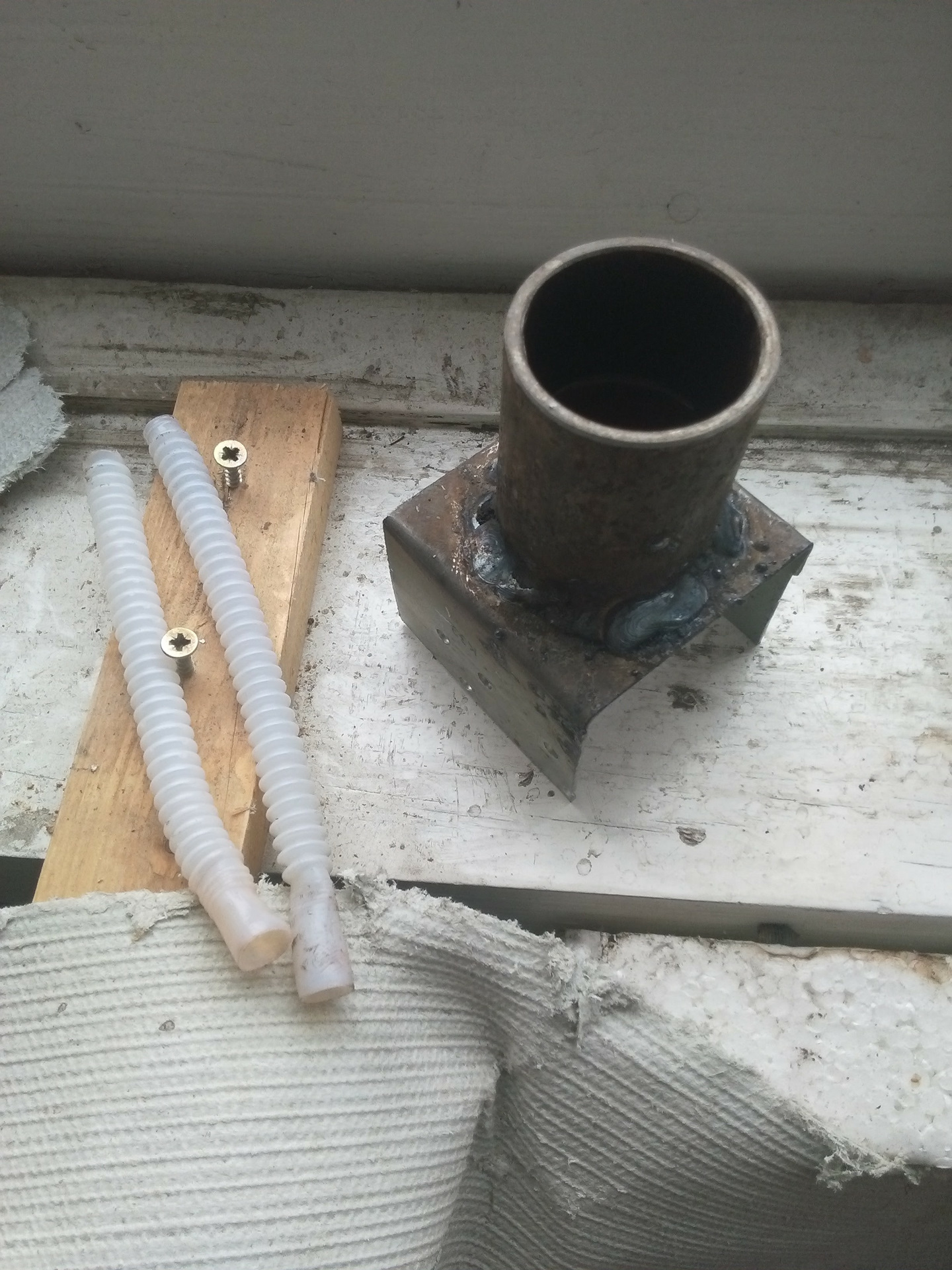 Обрезок трубы. Приварен к подставке, проверен на прочность ударом об пол (уронил). Подставка для возможности греть снизу и уменьшить теплопотери со дна.