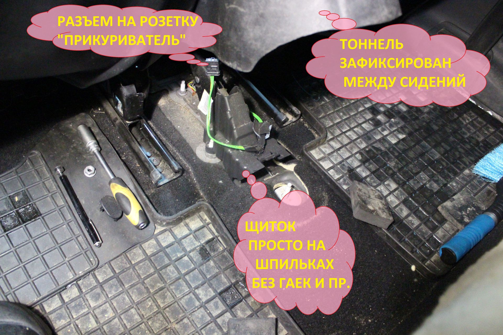 — снимаем тоннель (откручиваем гайку крепления тоннеля, прикладывая небольшое усилие, сдвигаем его назад и немного приподнимаем его (не забывая отключить провод розетки «прикуривателя»), зафиксировав его меж кресел);