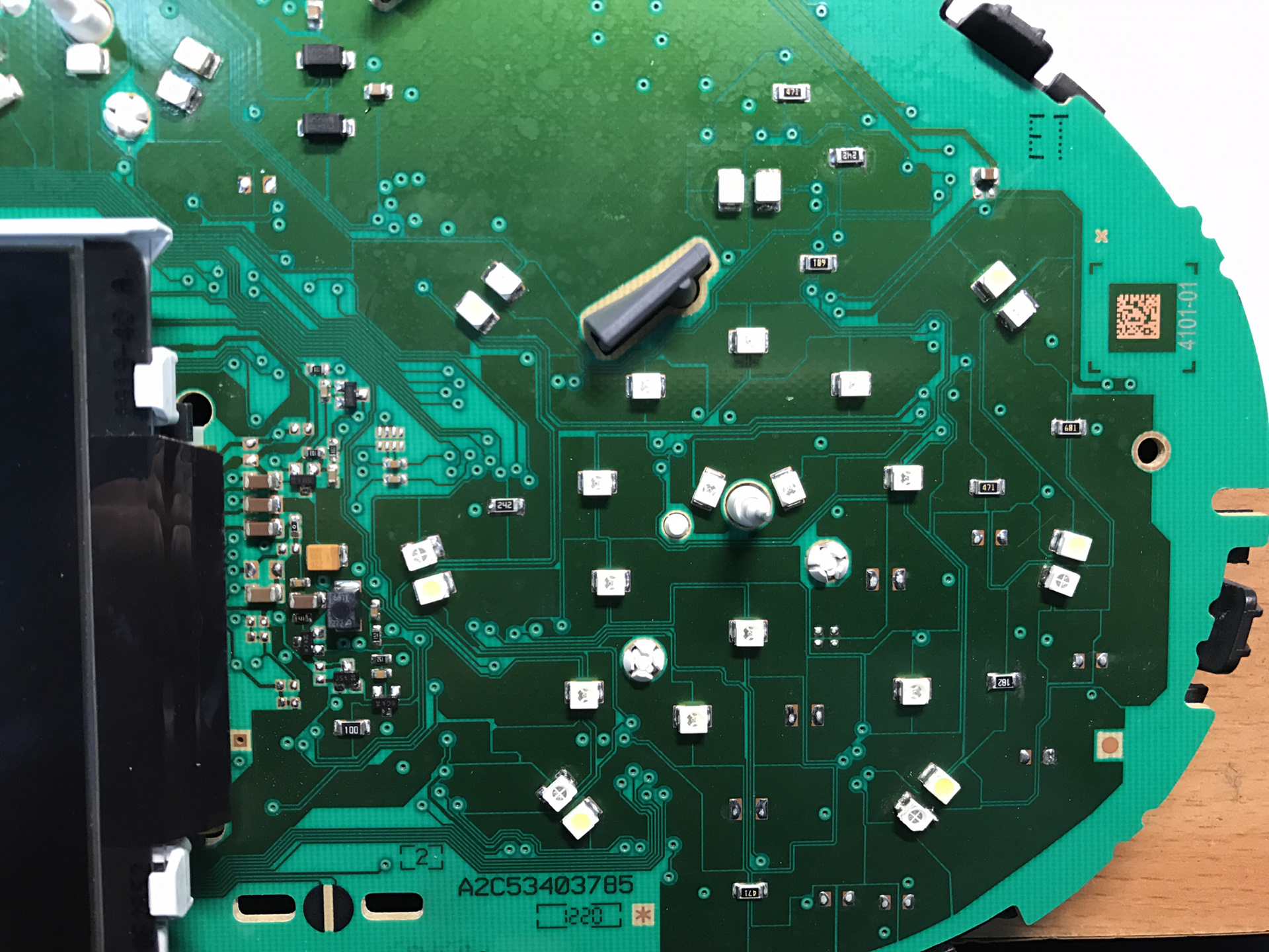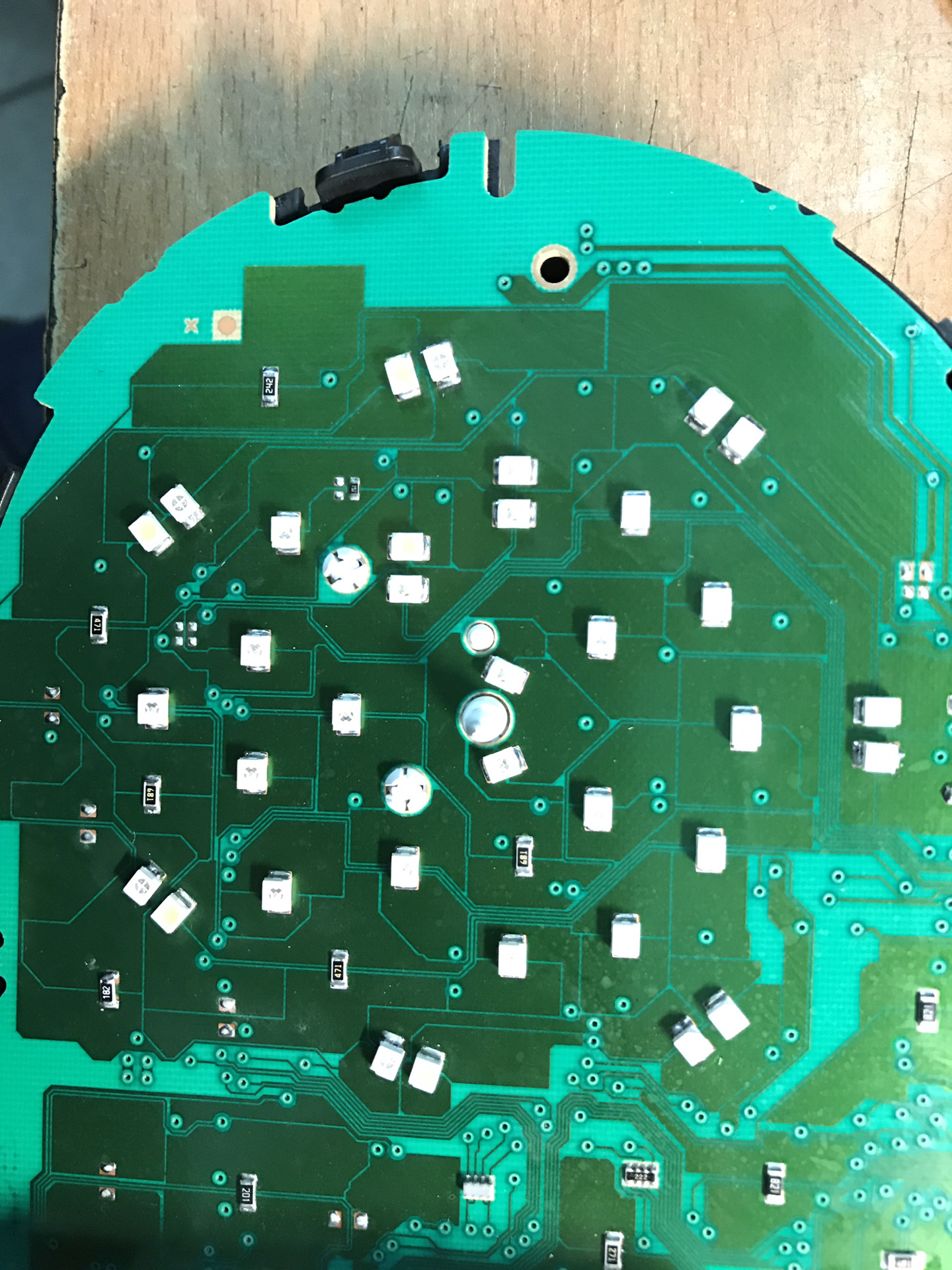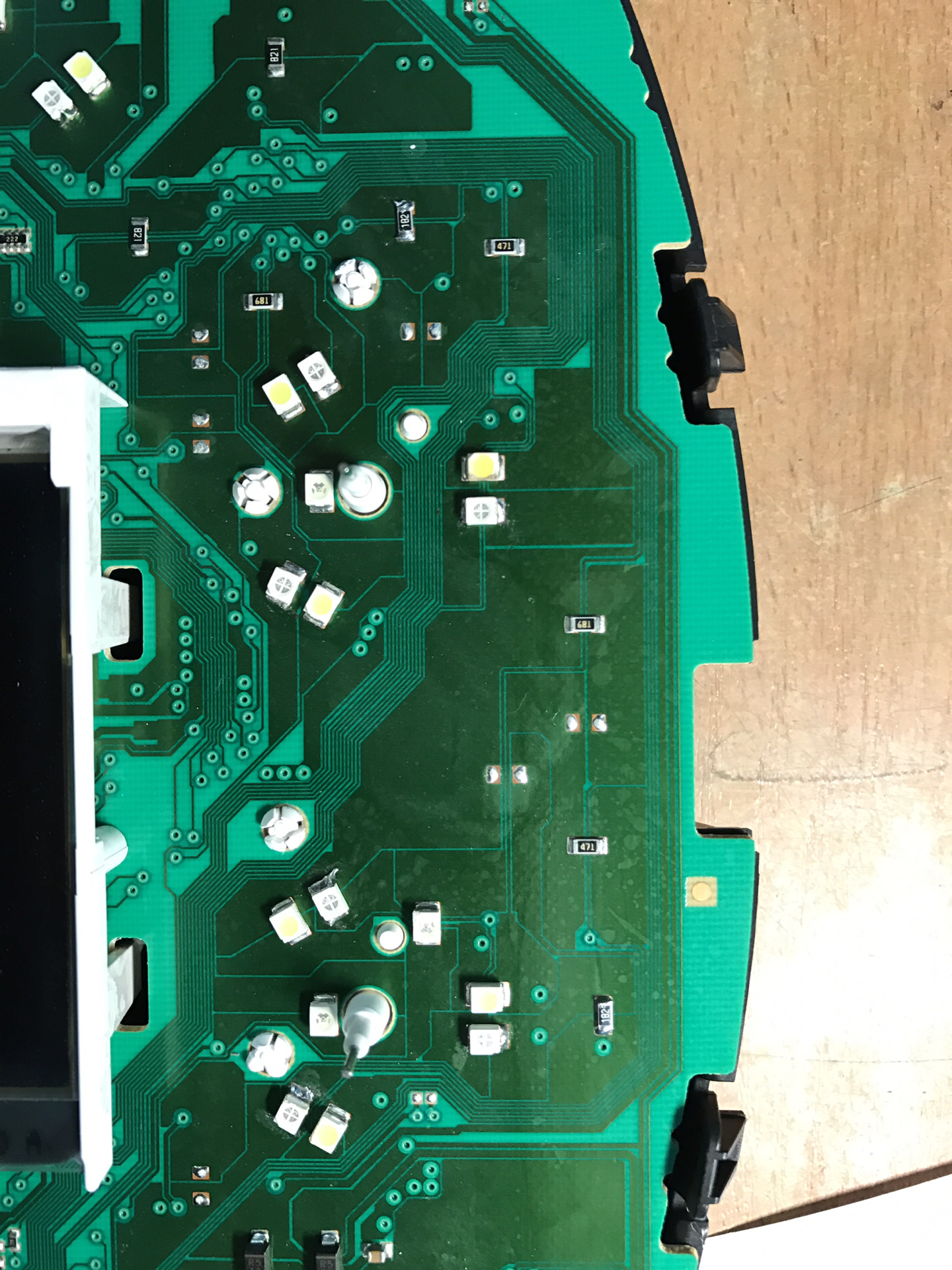 На Инсигнии это реализовать достаточно просто, нужны красные диоды и резисторы двух номиналов. А дальше паяльником припаиваем все это добро на приборку. С первого раза не получилось, не ожидал я такой подставы от GM, некоторые красные диоды надо паять в обратном направлении от белых диодов. Ниже есть фото моего первого пробного запуска, где красным не горят три диода на спидометре и не горят кольца бензина и температуры двигателя. Позже я это исправил.