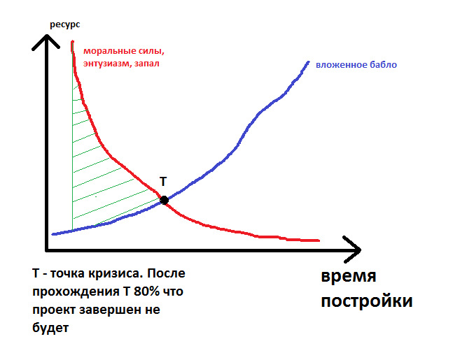 В один прекрасный момент в проекте наступает точка Т, после которой сил нет вообще, но при этом проект продолжает жрать бабло в виде аренды, слабых попыток продолжить, и впоследствии, забрасывается или идёт с молотка. (см график).