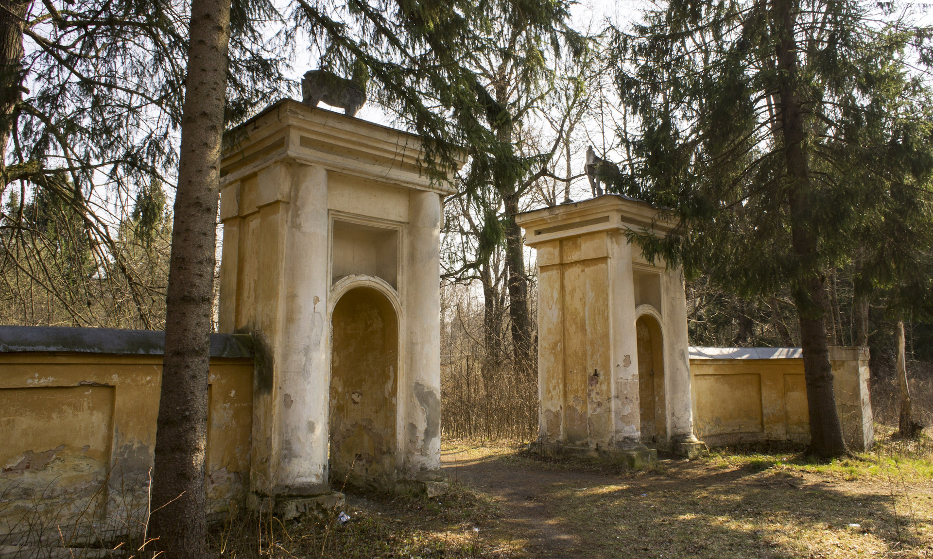 От ворот по заросшей аллее идем налево в парадную часть. Нас встречают огромные пилоны главного въезда, со скульптурами оленей наверху. Точнее, что скульптуры когда-то были именно оленями остается только догадываться, сейчас это просто безрогие и безголовые существа.