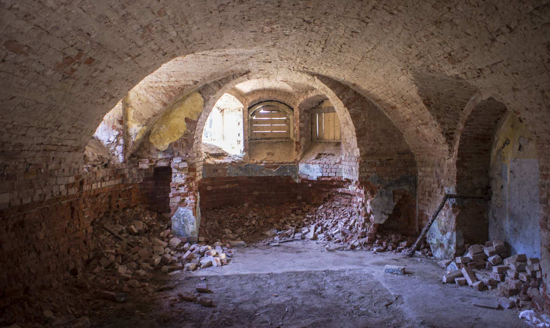 Еще можно спуститься в подвал — очень большое помещение со сводчатыми потолками с массой комнатушек.