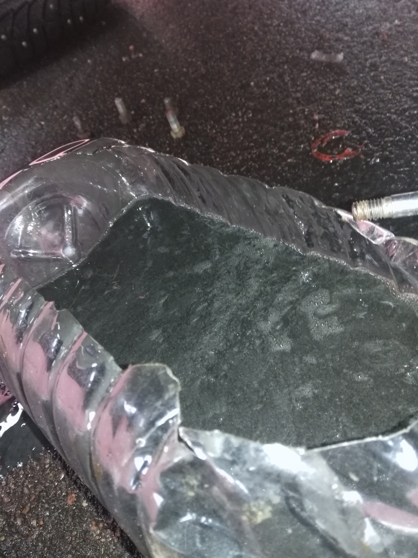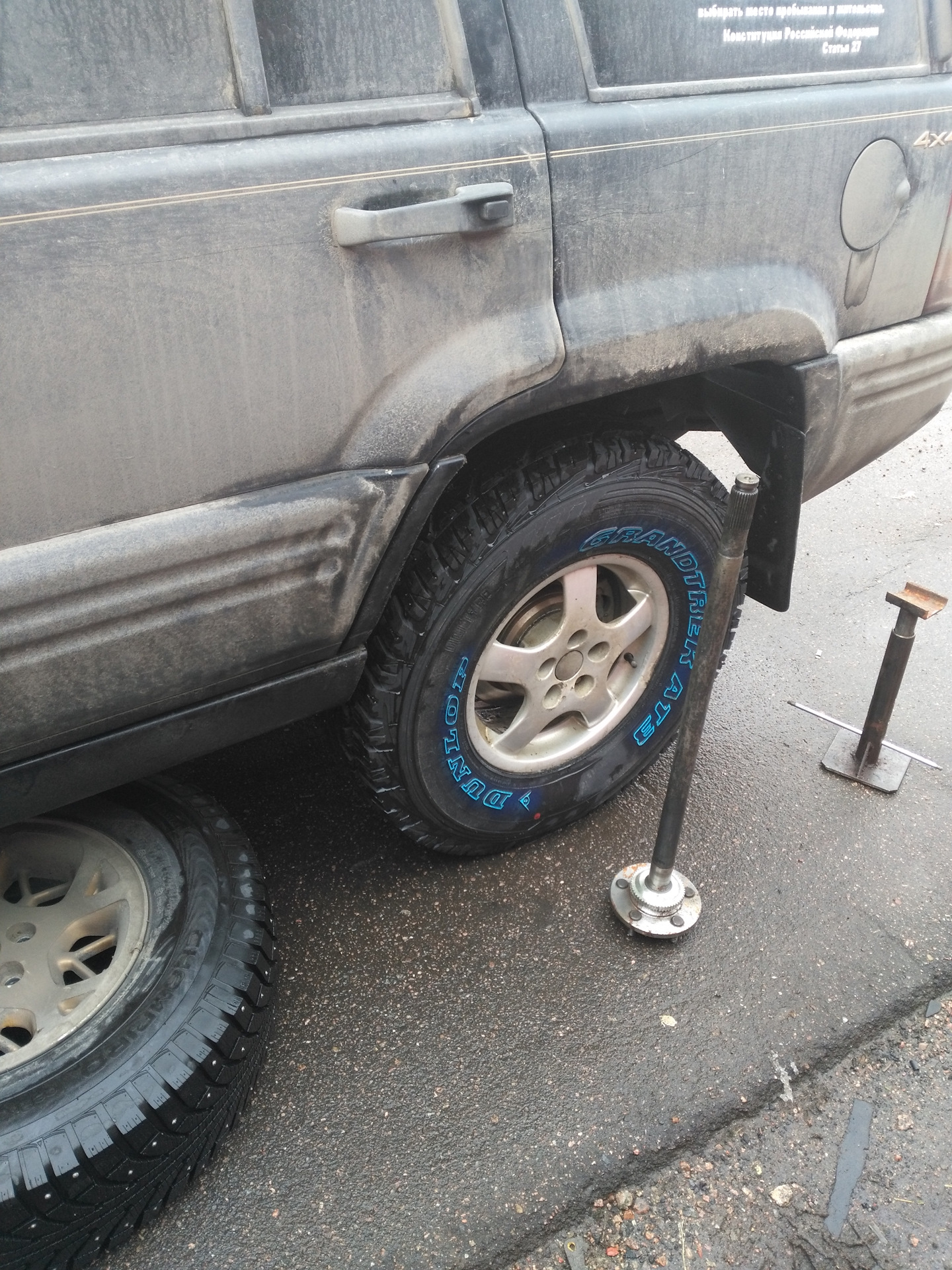 Далее оценил свои возможности, одежду, погоду (сегодня в Питере +1С), в гараже болото, нашел кусок места с асфальтом — туда и поставил машину нужным колесом. Герметик был, тряпки тоже, инструмент в наличии, полуось запасная есть — надо делать (((