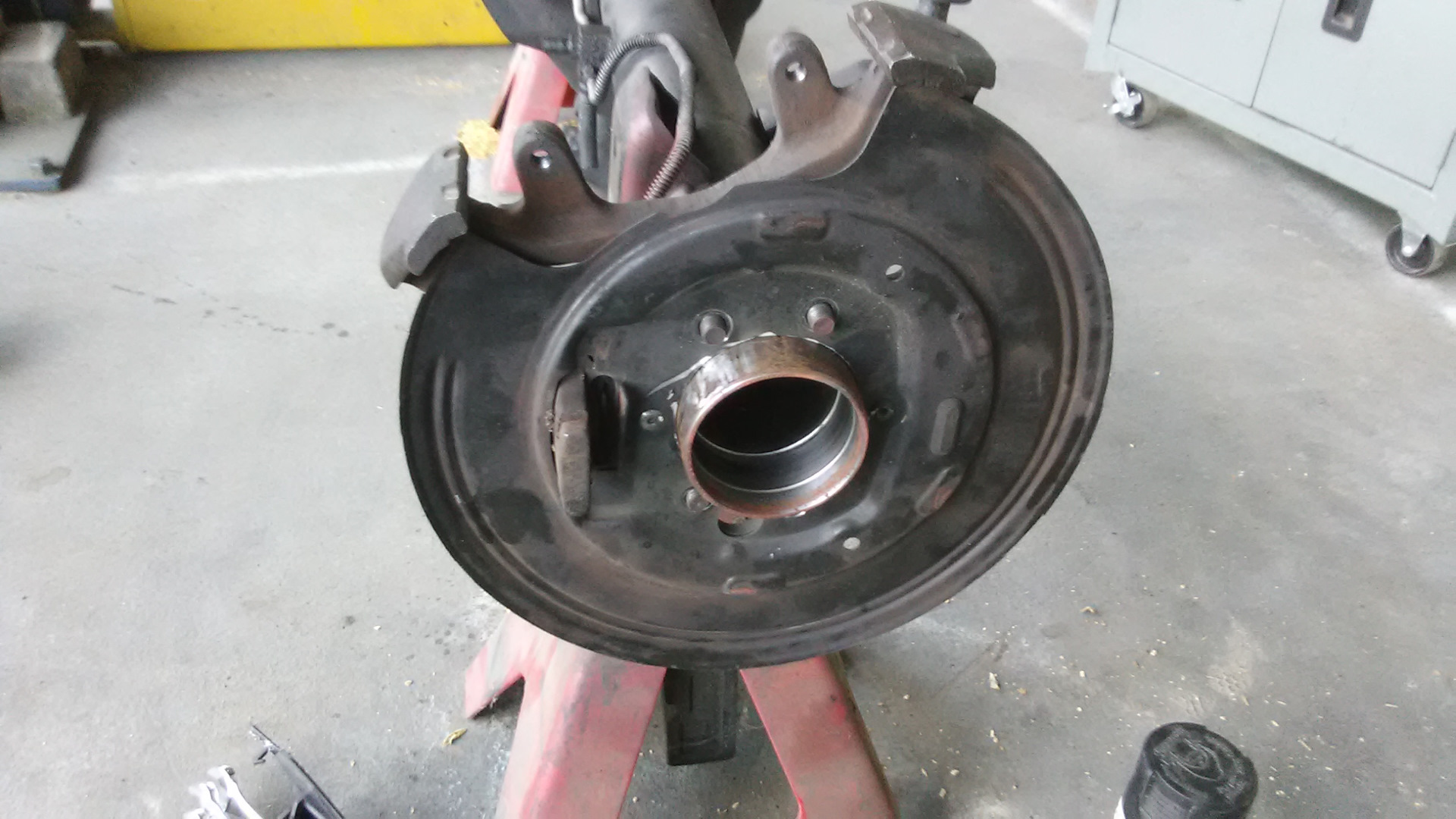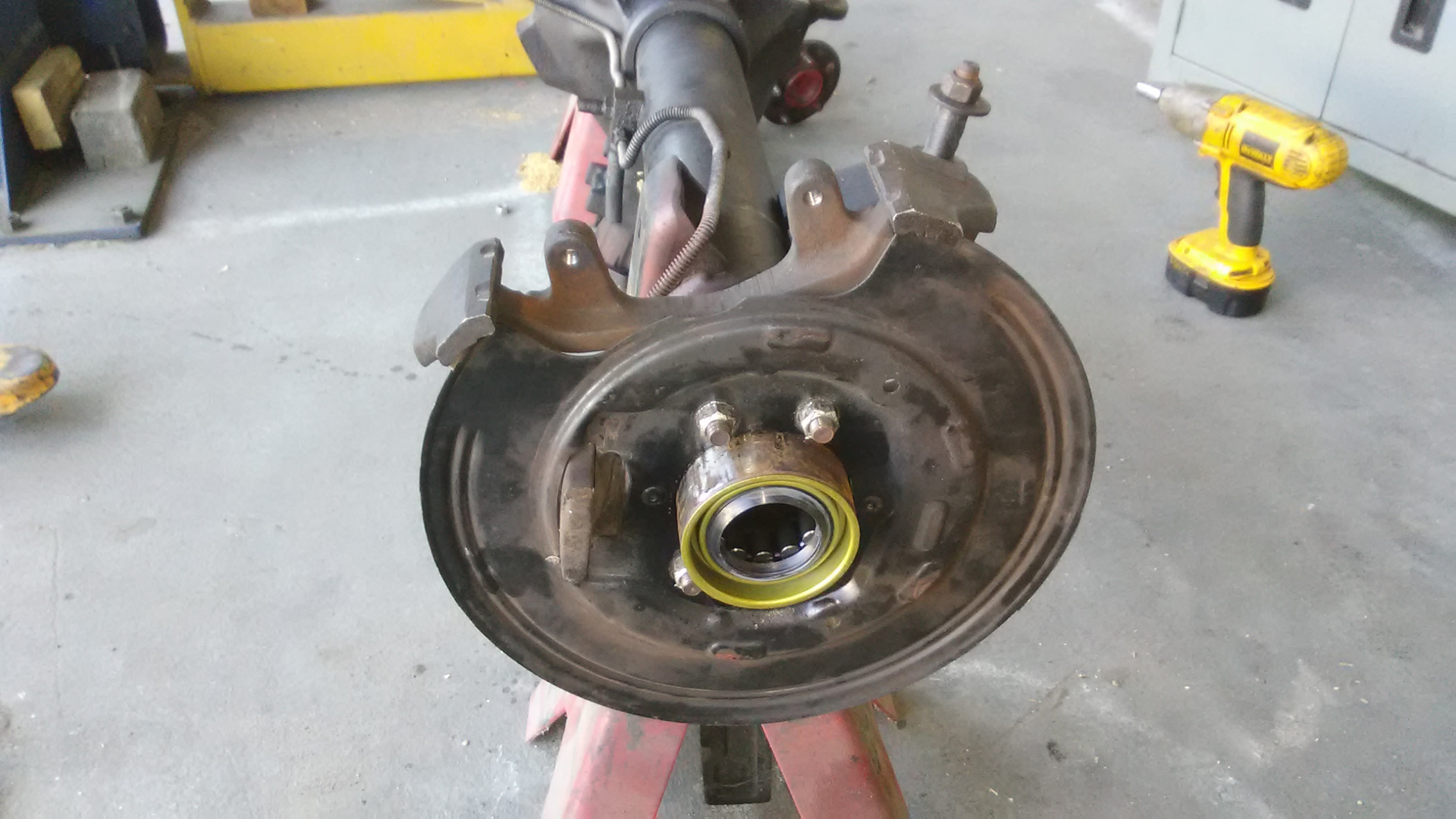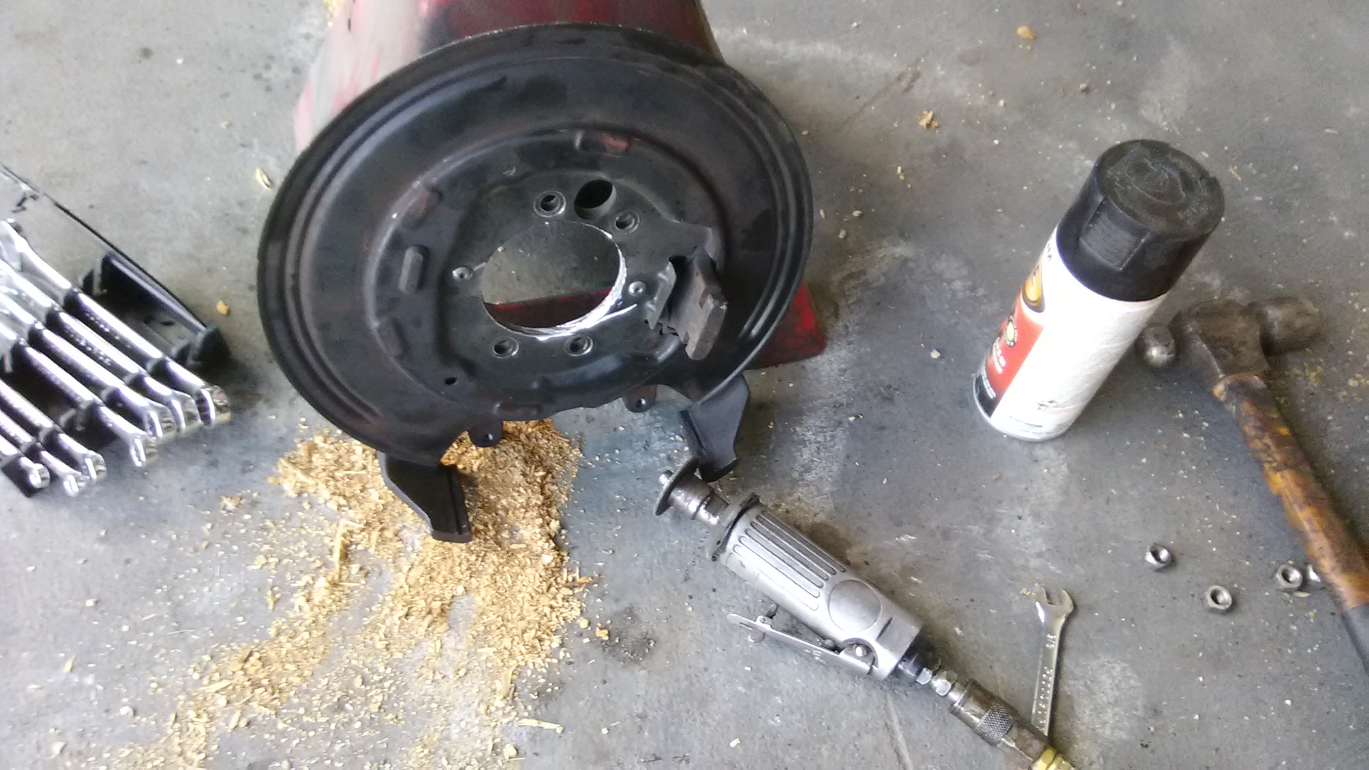 Пока чулок пустой примеряем тормозные щиты дисковых тормозов. Так как сняты они были с 35 Даны, (44 не было, а с либертосом рисковать не стал), то центральное отверстие на них слегка поменьше чем диаметр чулка рестайлового Крайслера 8.25. Нет, если взять молоток потяжелее, то оно бы залезло конечно, но мы же все культурные люди и любим чтобы все было по обоюдному согласию. Потому берем пневматический напильник и закрываем вопрос. Снять нужно буквально несколько десяток, времени заняло минут 5 — 7 на сторону.