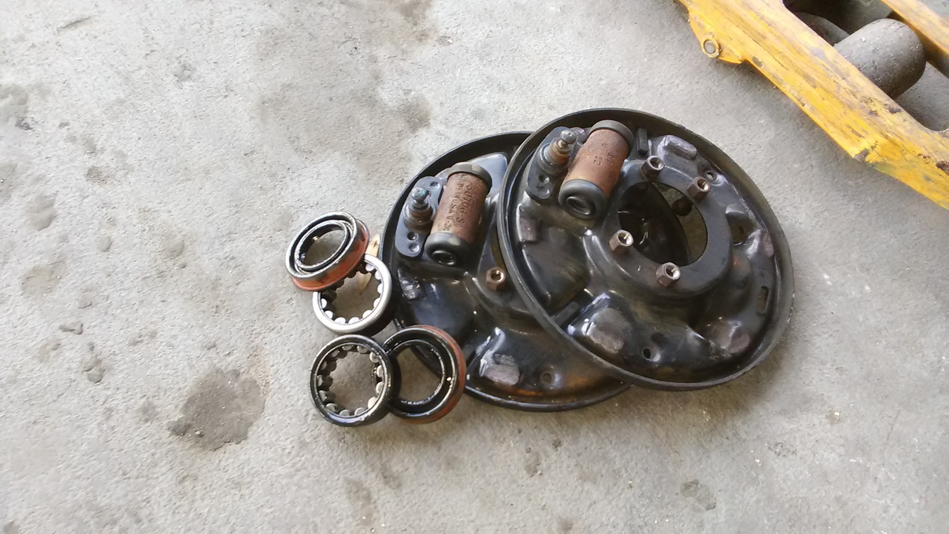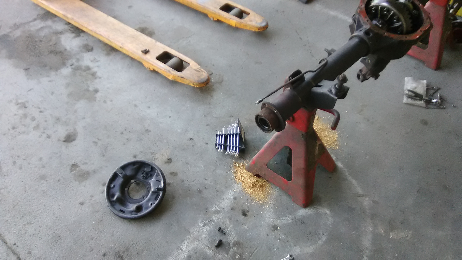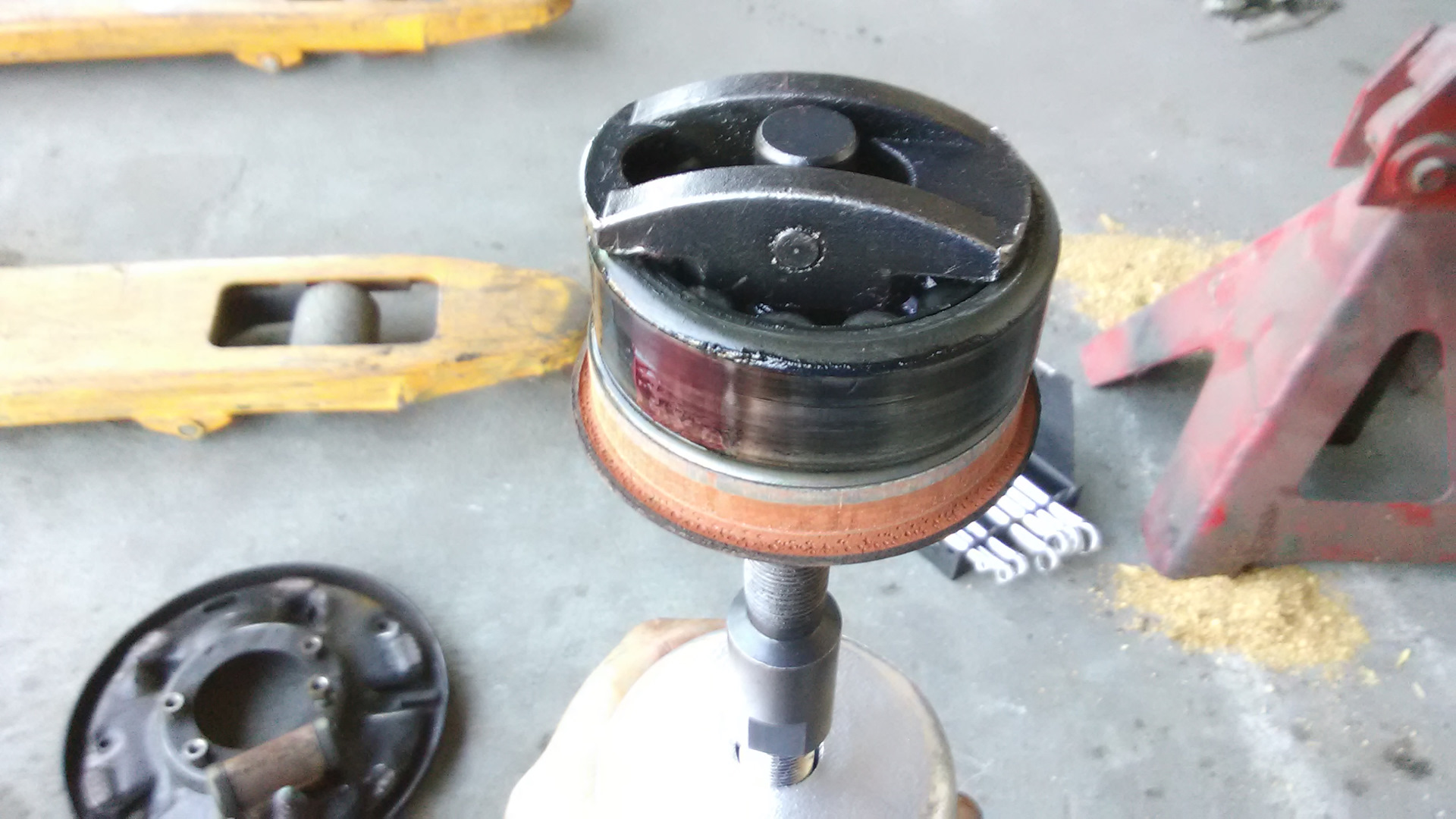 Пока чулок пустой примеряем тормозные щиты дисковых тормозов. Так как сняты они были с 35 Даны, (44 не было, а с либертосом рисковать не стал), то центральное отверстие на них слегка поменьше чем диаметр чулка рестайлового Крайслера 8.25. Нет, если взять молоток потяжелее, то оно бы залезло конечно, но мы же все культурные люди и любим чтобы все было по обоюдному согласию. Потому берем пневматический напильник и закрываем вопрос. Снять нужно буквально несколько десяток, времени заняло минут 5 — 7 на сторону.