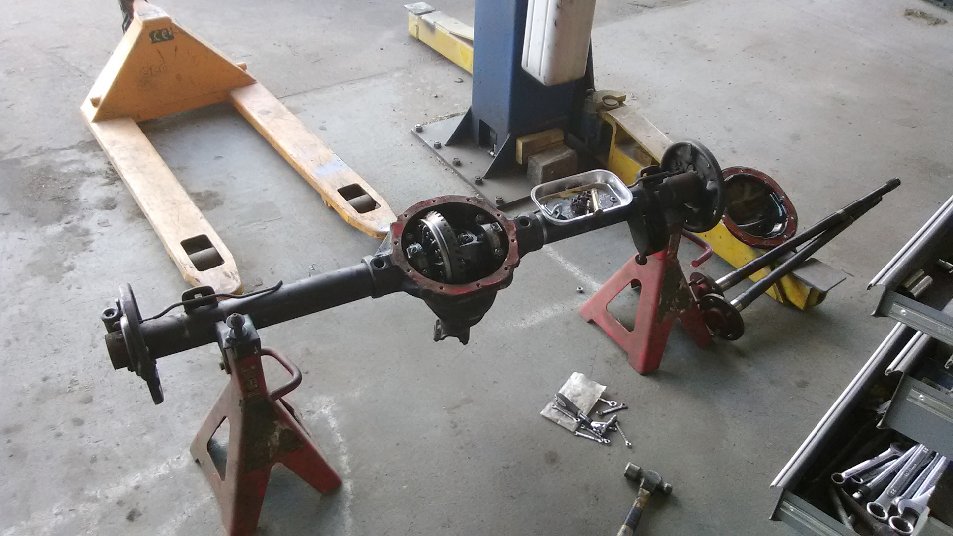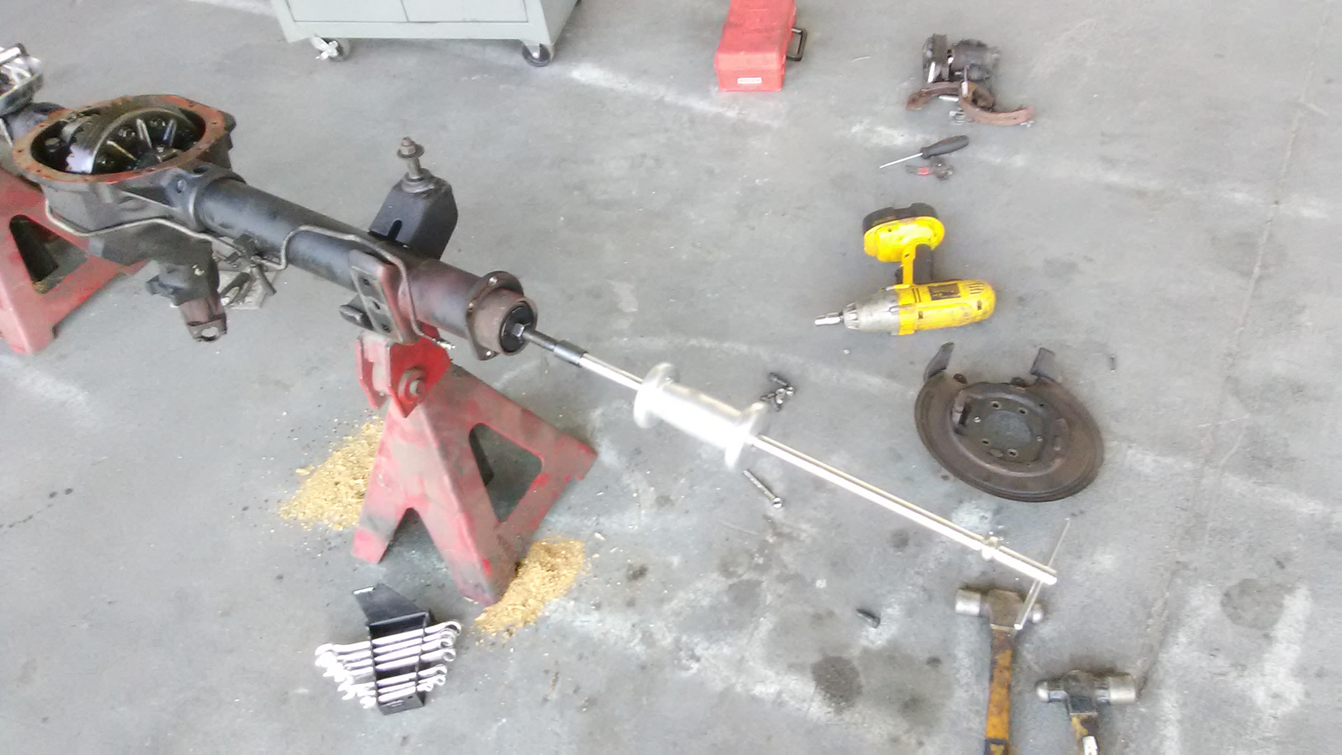 По результатам предыдущего осмотра было принято решение превентивно заменить подшипники и сальники полуосей. Чтобы их заменить нужно их сначала выколупать. Порывшись по углам нашел две более — менее подходящие приспособы.