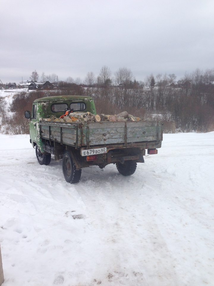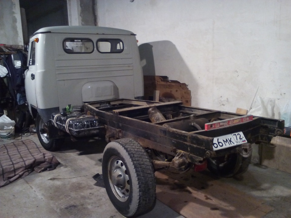 На момент покупки на Уазке стоял старый гнилой деревянный кузов.Купил еще один уаз со свежим металлическим кузовом 2013 года, обрезал его по 40 мм с каждой стороны, чтобы он не был шире кабины. Так как новые головастики уже диннобазные, соответсвенно кузов тоже был длиннее штатного, укоротил до 2510мм(как раз входит лист гипсокартона и др.строительные материалы)и установил.На момент обрезки и установки на улице зима, а гаража пока нет, в местах обрезки не покрасил.Скоро начну делать самосвал и все до кучи покрашу).