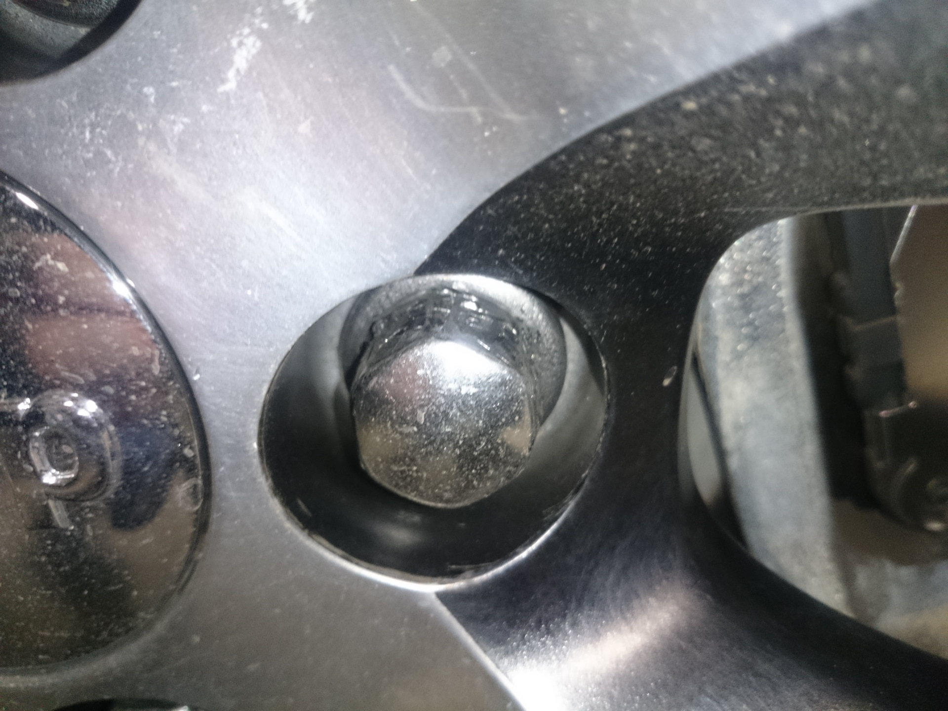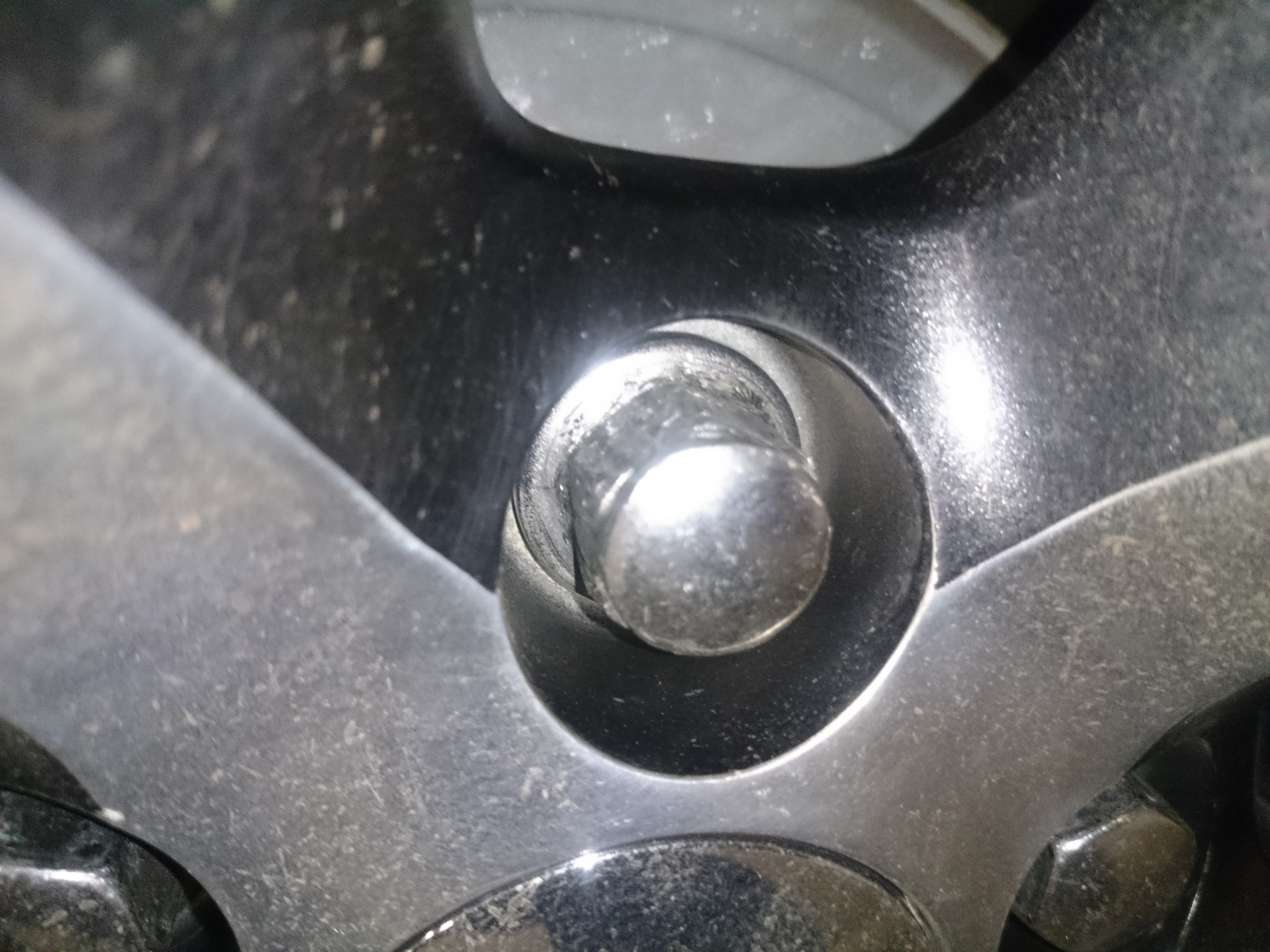 С большим трудом удалось обратно вкрутить 4 из 5 болтов, доехать до монтажа, где матерящийся мастер, не взяв с меня ни копейки, развальцевал болт — отковырял с него декоративный хромированный колпачок.