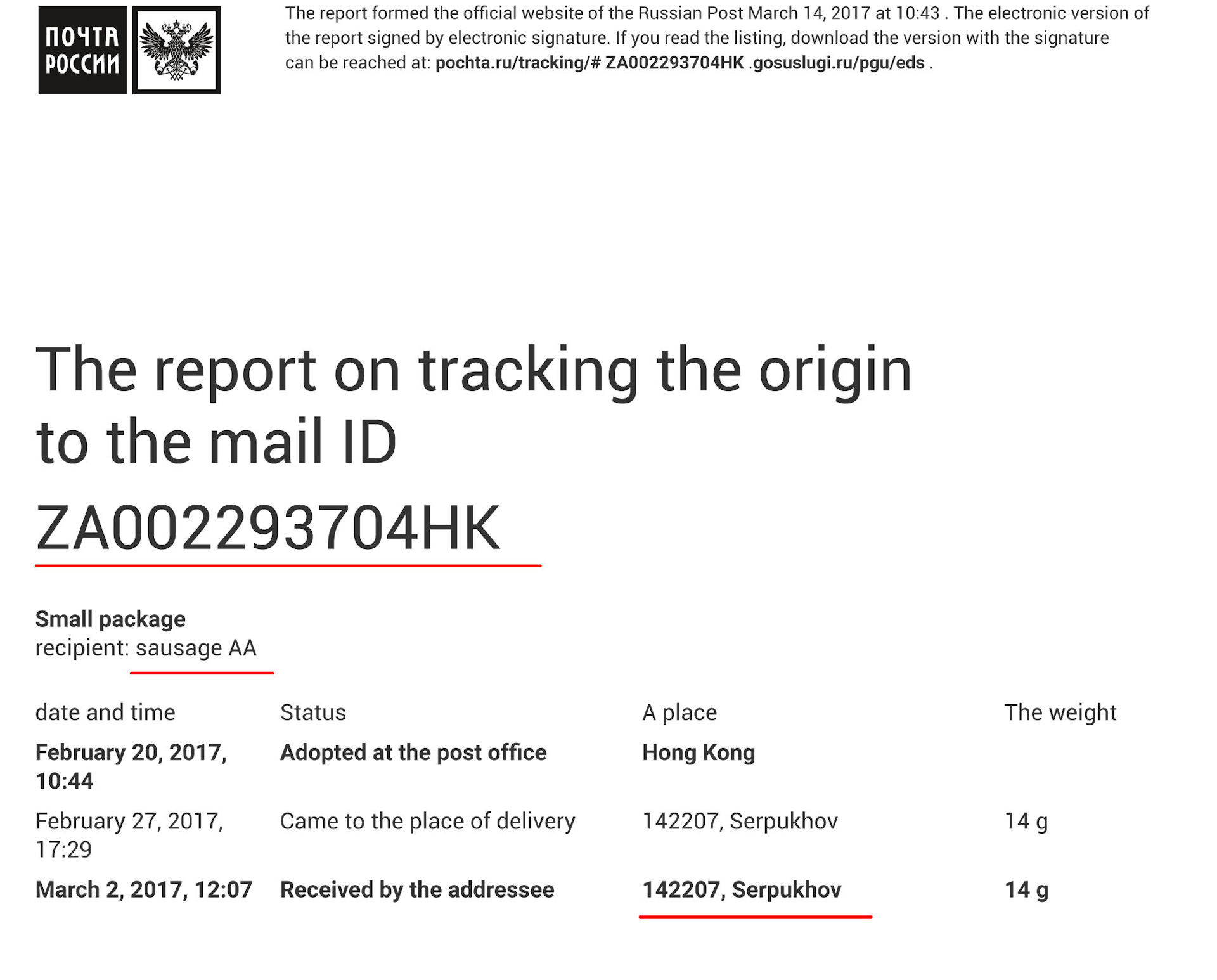 Т.е. факт того что адреса мой адрес и адрес куда было отправлено не является подтверждением. Продавец отправил — отправил. Куда — насрать.