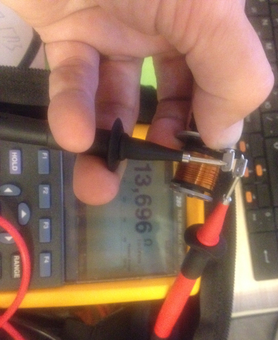 я взял мой старый соленоид, каково было мое удивление — когда вне блока сопротивление было сначала 11,7 Ом, дома после снятия железного кожуха соленоида (под ним было много окислов, руки черные были) и после промывки в УЗ ванне сопротивление обмотки стало 13,6 Ом (напомню со слов мастера на блоке замер показал 9 Ом). Под нагрузкой (фото ниже) 12 вольт, 1А соленоид грелся, сопротивление как и полагалось при нагреве еще подрастало, слышны щелчки сработки электромагнита.