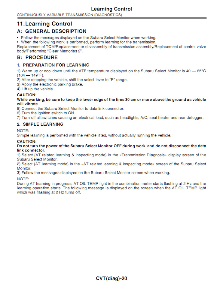 Я не то, чтобы спорить буду, но вот скан мануала. Там четко прописано, что обучение производить стоит в следующих случаях: … Замены жидкости там не значится — только аппаратная замена блоков. Правда есть какой-то сброс памяти, но по нему я ничего найти не смог. Кроме того, повторяю — в официальном сервисном мануале нет ни слова о необходимости какой-то процедуры обучения при смене жидкости вариатора.