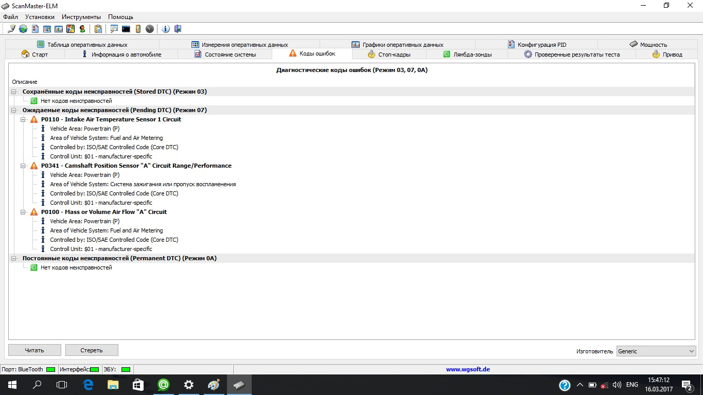 Ради эксперимента скинул фишку с расходомера, появились ошибки P0110 — Датчик температуры воздуха на впуске и P0100 — Неисправность в цепи расходомера воздуха. Не знаю почему но отображаются как и стираются они только после включения выключения зажигания, скинул фишку на работающем моторе ошибки нет, заглушил завел появилась, так же и со стиранием стер в программе, но она отображалась до того момента пока не выключил зажигания и опять не включил. Не знаю может так и задумано.