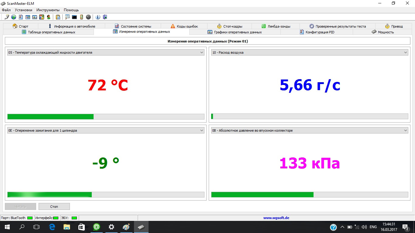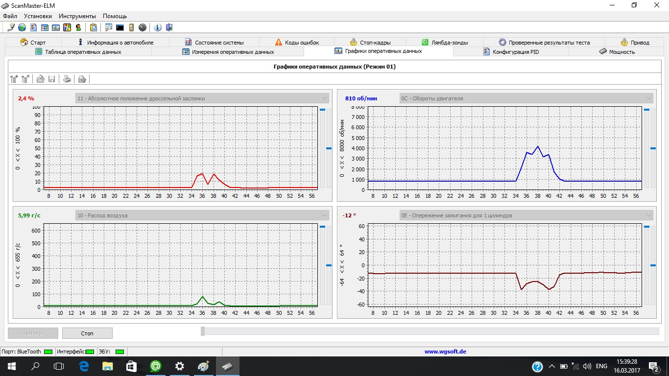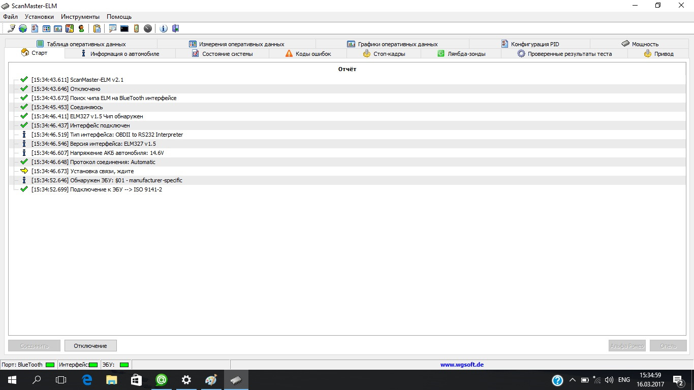 Далее на первой же вкладки которая называется "Старт" жмем "Соединить". Несколько секунд определяется сканер и протокол, все в автоматическом режиме, и собственно все, в программе можно работать.
