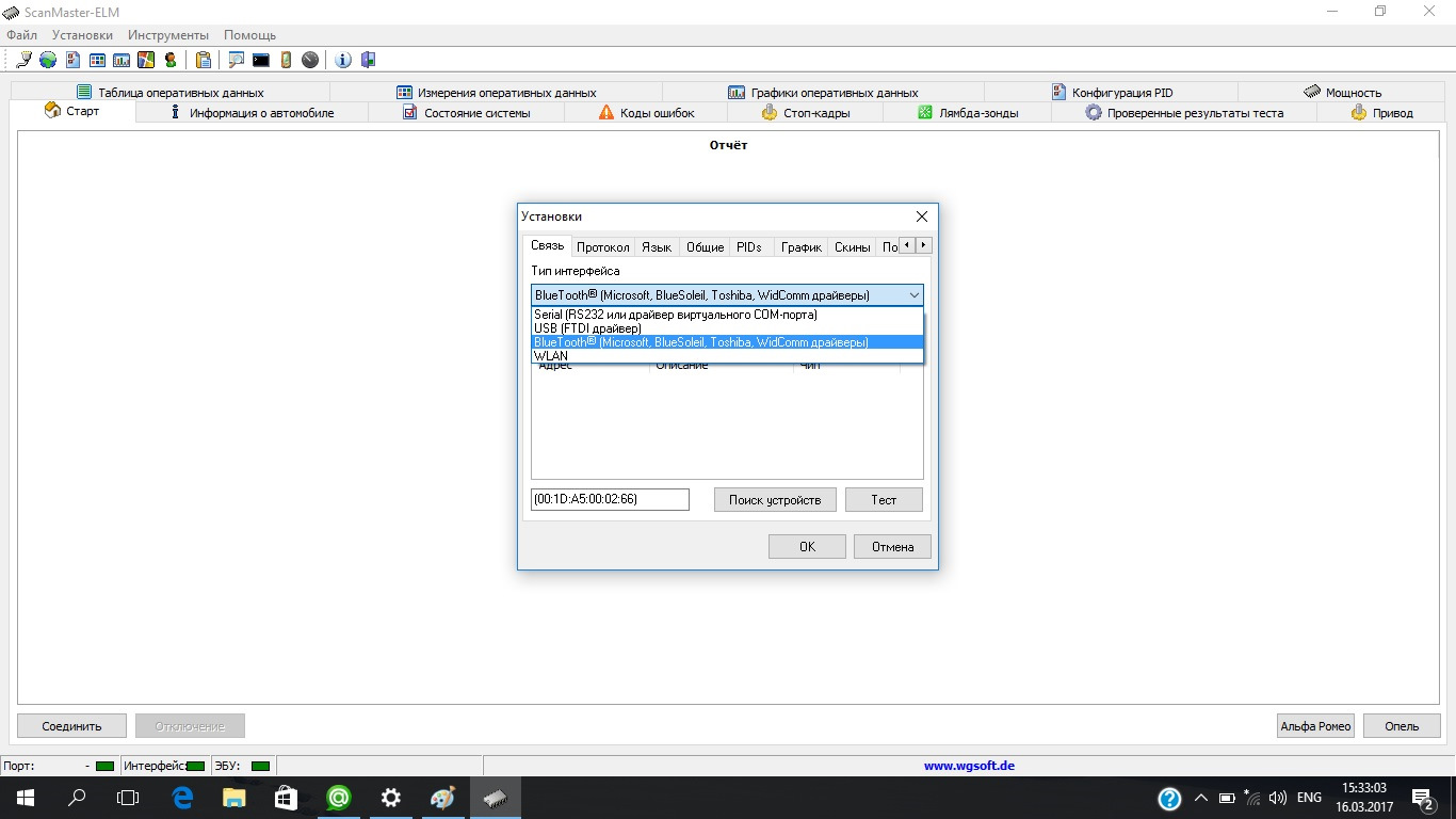 Прогу использовал ScanMaster-ELM v2.1 со сканером на диске была v1.7, но она отказалась работать с 64 битной виндой. Открываем программу выбираем вкладку Установки/Связь там выбираем тип интерфейса Bluetooth, жмем сначала поиск устройств, затем выбираем в списки найденный сканер и жмем тест. После того как все определится закрываем это окно.