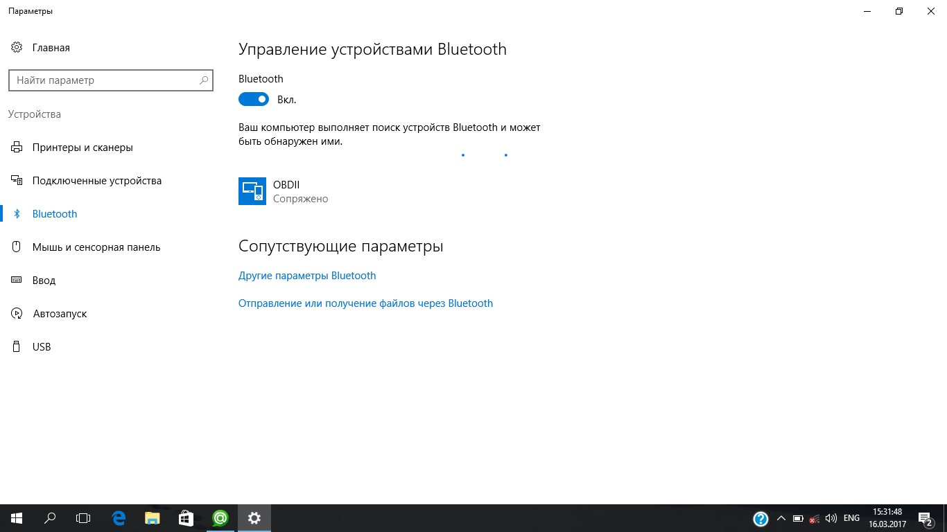 Далее через Bluetooth находим сканер и подключаем его к ноуту (пароль на всех ELM327 как правило "1234") На тестируемом ноуте стояла 64 битная Windiws 10. Не каких драйверов или еще чего то не спросило все с ходу заработало.