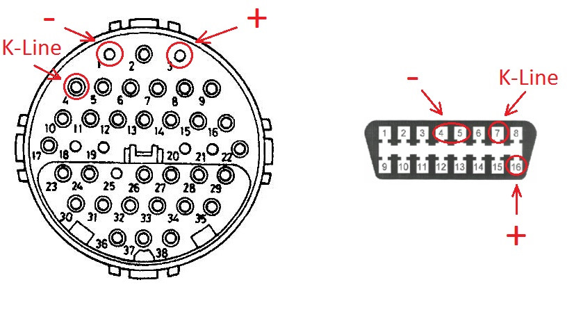 Из чего видим что нам нужно взять: 1 — питание +12 В, массу и K-линию диагностики системы управления двигателем. В итоге получается вот такая схема подключения (16 pin разъем со стороны "мама" как если бы в него нужно было вставлять сканер, смотря на сканер все будет зеркально!)