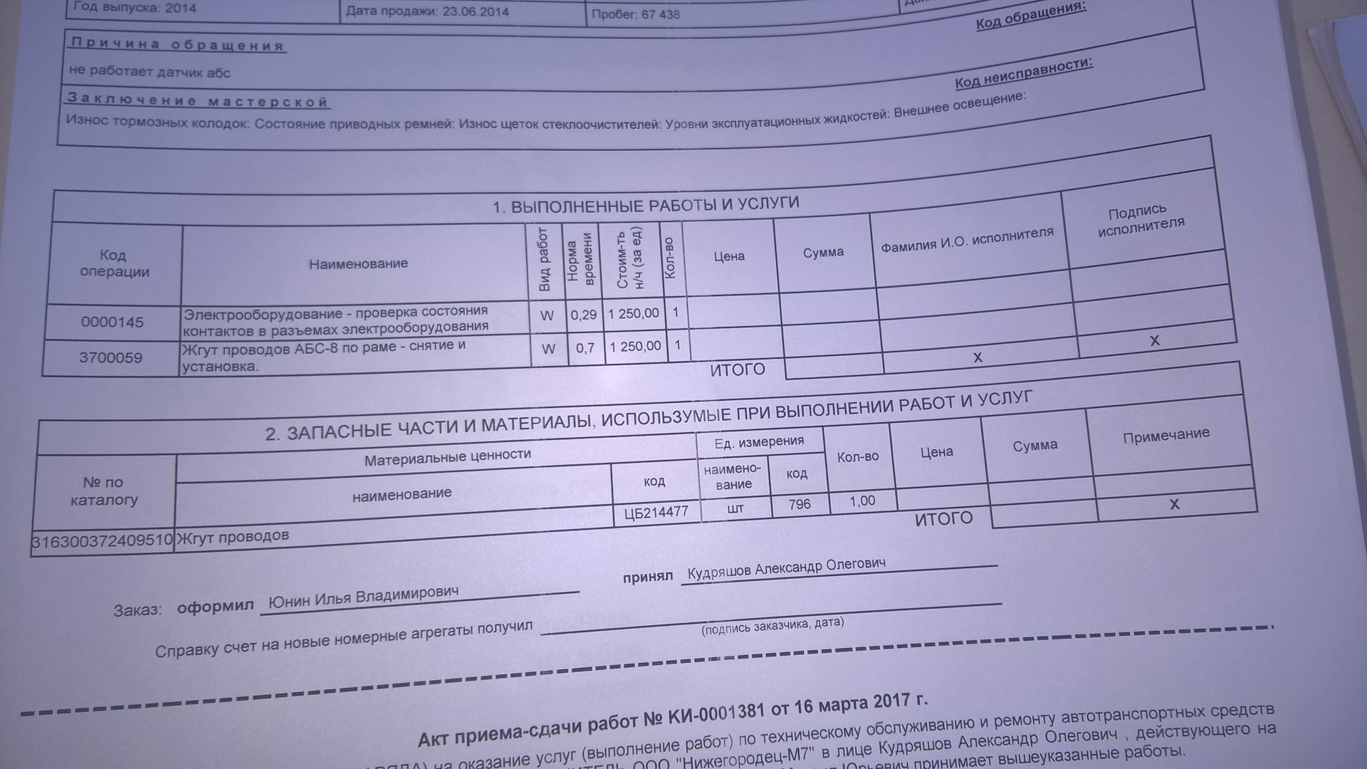 Еду домой- меняю! Ура! Всё работает, но… недолго длилось счастье- "жёлтый глаз" загорелся через 20 минут поездки… Потом снова погас и снова загорелся… Так продолжалось несколько дней, и в итоге я поехал к дилеру. На работе завал, дома тоже дел по-горло, времени копаться нет, думаю лучше заплачу… Через пару дней отзвонились- результат множественные обрывы внутри жгута. Контакт то есть то нет… В общем вся эта беда признаётся гарантийным случаем и через 1,5 недели ожидания меня приглашают на гарантийную замену жгута проводов АБС.