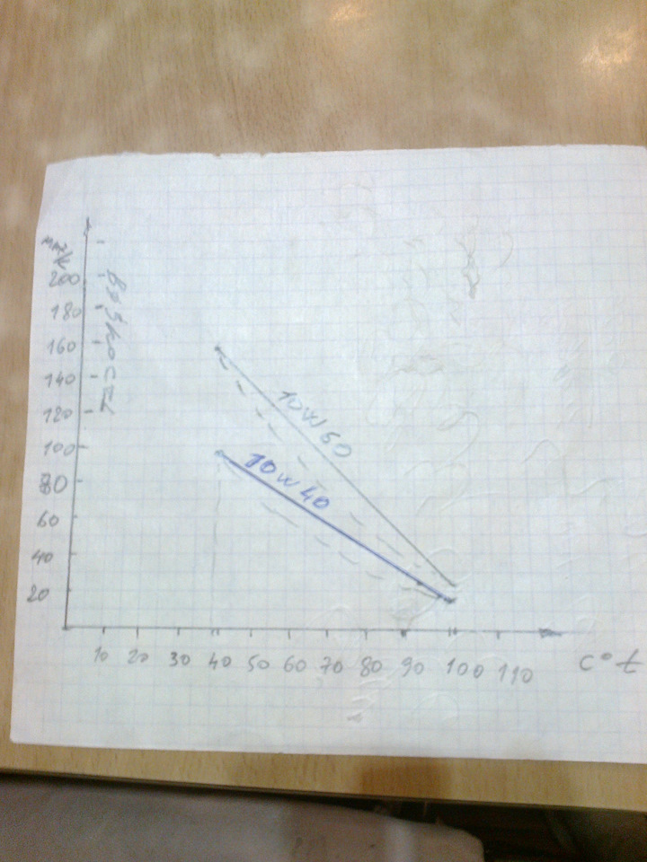 Вот что попусту бездоказательно болтать. Берем цифры из характеристик масел и строим график. Надеюсь местные гонщики хорошо учились в школе, и умеют читать графики и делать выводы. И так масло 10W40 вязкость при 40 градусах примерно 96 мм кв/c., вязкость при 100 градусах примерно 14.3 мм кв/c. Масло 10W60 вязкость при 40 градусах примерно 160 мм кв/с, вязкость при 100 градусах примерно 23 мм кв/c. Вязкость масла 10W60 при 100 градусах соответствует вязкости масла 10W40 при 93 градусах. И эта разница в вязкости для двигателя не имеет значения. А вот если двигатель начинает слегка перегреваться, то у масла 10W40 вязкость начинает быстро скатываться на запредельные 9 мм кв/c и ниже, а у 10W60 имеется солидный запас по вязкости пока она скатится до 9 мм кв/с, и это имеет огромное значение для двигателя. Я взял линейную зависимость, для упрощения, и отсутствия других данных по маслу, но даже если зависимость нелинейна (отмечено пунктиром на графике) то это сути не меняет.