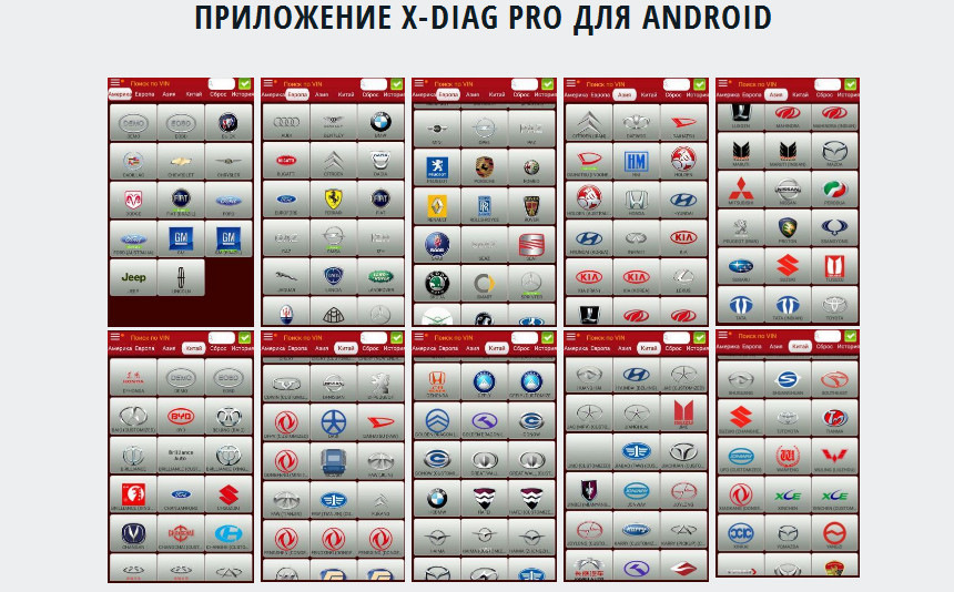 Launch X-431 Pro поддерживает диагностику электронных систем управления автомобилей европейского, американского и азиатского производства (включая праворульные японские автомобили). Широкий диапазон марок автомобилей: Smart, America Ford, Chrysler, GM, Acura, INFINITI, Lexus, Australia Ford, Holden, Brazil GM, Brazil Fiat, Brilliance Auto, BYD, Changan, ChangCheng, Changhe, Chery, GEELY, Gonow Auto, HaFei, JAC, Jiangling, SGMW, Tianjin FAW, Xiamen, XinKai, ZhongShun, Zhongxing, ZOTYE, Audi, Benz, BMW, Citroen, Europe Ford, Fiat, Jaguar, Lancia, Landrover, Opel, Peugeot, Porsche, Renault, Romeo, Rover, Saab, Seat, Skoda, Transporter&V-Class, Volkswagen, Volvo, Mahindra, MARUTI, TATA, Daihatsu, Honda, JPIsuzu, Mazda, Mitsubishi, Nissan, Subaru, Suzuki, Toyota, Daewoo, Hyundai, Kia, Ssangyong, Perodua, Proton, GAZ, VAZ, S.Africa Opel, Thailand Isuzu, а также любые автомобили, поддерживающие стандарт OBD II/EOBD (шины данных SAE J1850 VPW, SAE J1850 PWM, ISO 9141-2, ISO 14230, ISO-15765-4 CAN).