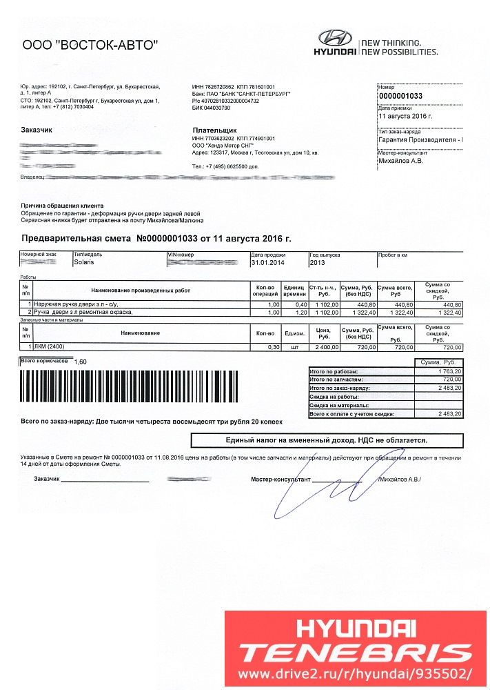 Не поверите, но через два дня (ведь могут оперативно, если по башке треснут!) мне отзвонился мастер-приёмщик ОД "Восток-Авто" (какой именно СТО я не сообразил спросить) и подтвердил, что после пересмотра случай признан гарантийный, замене и перекраске подлежат две левые ручки (водительская и задняя пассажирская), запчасти уже заказаны, и пригласил приехать через 2 недели.