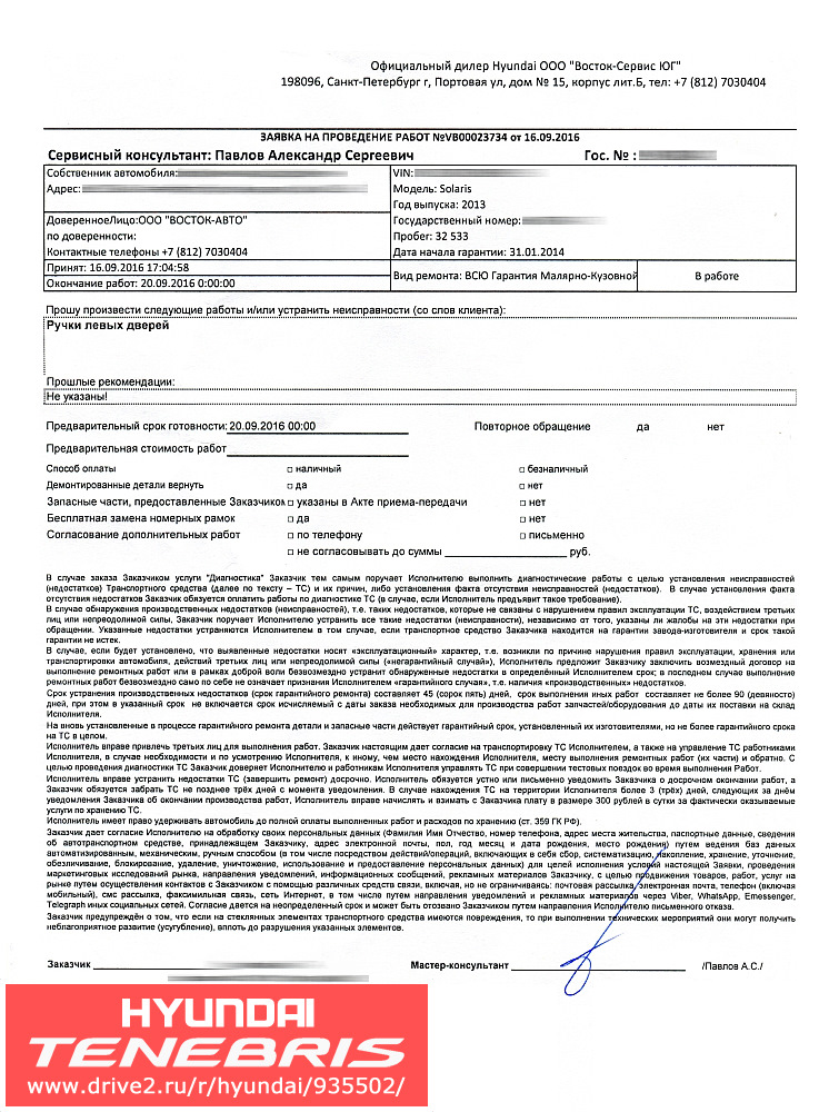 После работы, 16 сентября я подъехал к указанному времени и прождав полчаса сверх положенного был принят. Составили заявку на проведение работ и забрали машину.