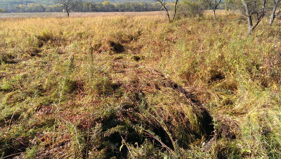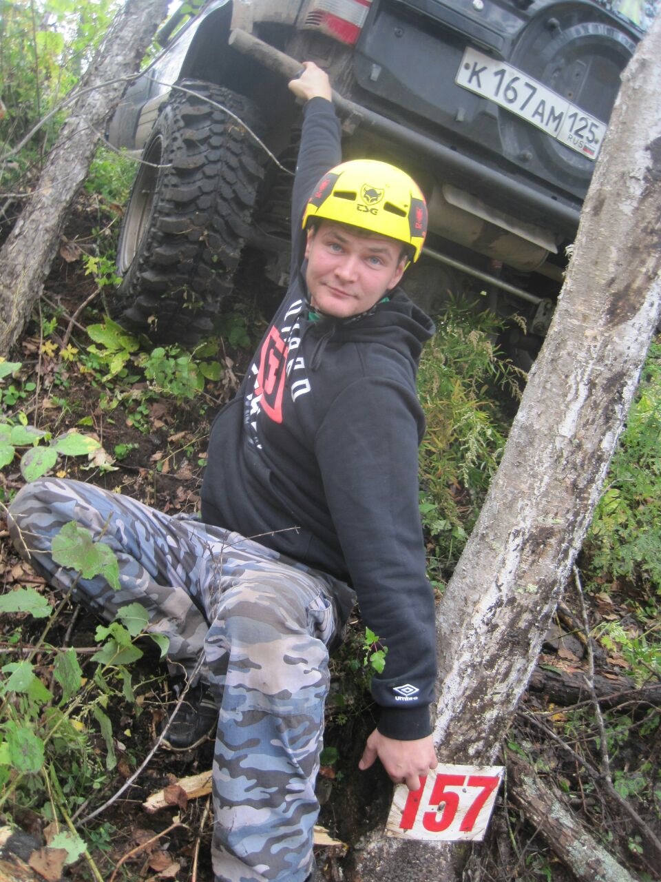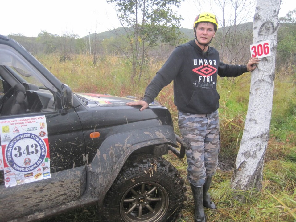 Во время движения передняя подвеска стала как будто мягче… ну думаю приработалась:) хорошо так, мягонько идет. Доехав до очередной канавы полной грязи, застряв и лебедясь, выяснилось, что едем на пробитом переднем колесе! Но, то ли из-за ширины диска, то ли из-за веса авто, оно не слезло с обода! По навигатору, нам ехать еще 5 км до лагеря и еще 2 точки на пути. Приняли решение ехать до лагеря. И тут из леса выезжает Прадик с моего класса, оказалось ребята взяли уже почти все точки и едут за последними. Пристроившись за ними продолжили движение в сторону лагеря, попутно пересекая реки по капот, глиняные подъемы, диагоналки, …ну все то, что пересекают, когда колесо пробито:) по пути взяли еще одну точку. По навигатору нам осталось примерно метров 700 до лагеря, но дорог нет, только поле с травой высотой под 2.5 метра, ничего не видно. Штурман сел на капот, в руках фанарик и мы прокладываем новую дорогу :) Осталось метров 150 до лагеря, видим грунтовую дорогу, и тут я допускаю ошибку…штурман шел справа от машины, а я решил поехать прямо, а там ждала специально для Джуньки выкопанная яма, глубиной 1,5 м. Такая ровненькая, прям идеальный прямоугольник, все стеночки 90 градусные…