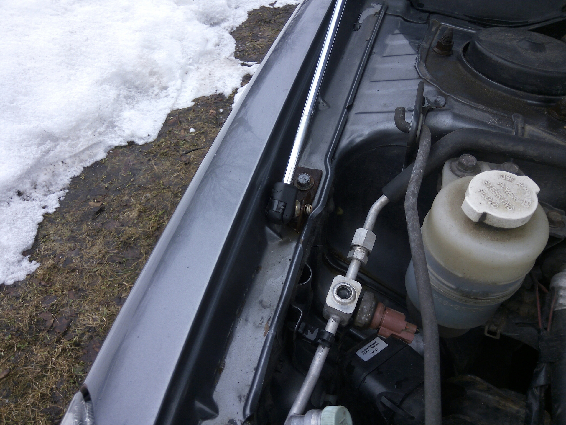 Сложного в установке ничего нет. Поставил за 10 мин, все работает и радует), Никаких щелей теперь нет. Единственное, надо убрать заводской упор капота и клипсу, которая держит этот упор. Они мешают друг другу). Плохо это тем, что, если в один день газовый перестанет держать, вариантов чем подпереть капот больше нет((. Да, если кто-то захочет себе такой сделать самостоятельно (там ничего сложного), могу сделать замеры)).
