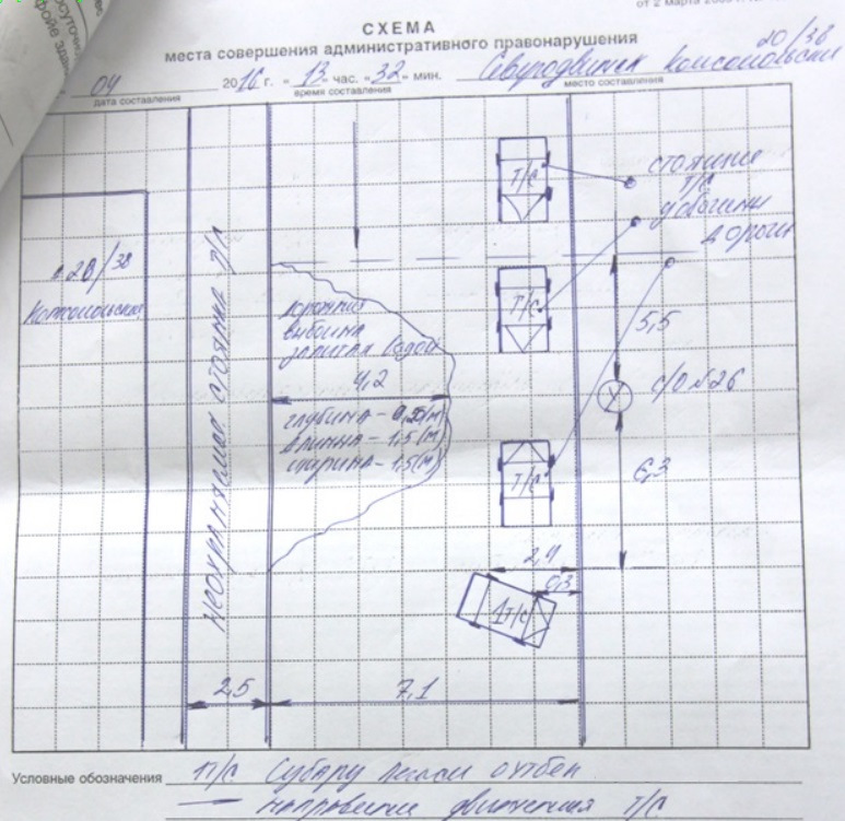 5. По приезду экипажа ГИБДД, советую принять самое действенное участие в дальнейшем, оформляем схему ДТП (яма не должна соответствовать ГОСТу, размеры ямы, зафиксировано отсутствие дорожных знаков и ограждений.), настаиваем на составление Акта выявленных недостатков в содержание дорог, получаем Определение об отказе в возбуждение дела об административном правонарушение, т.е. о не привлечение Вас в качестве виновника ДТП (основание, — предвидеть и избежать ДТП, Вы не могли)
