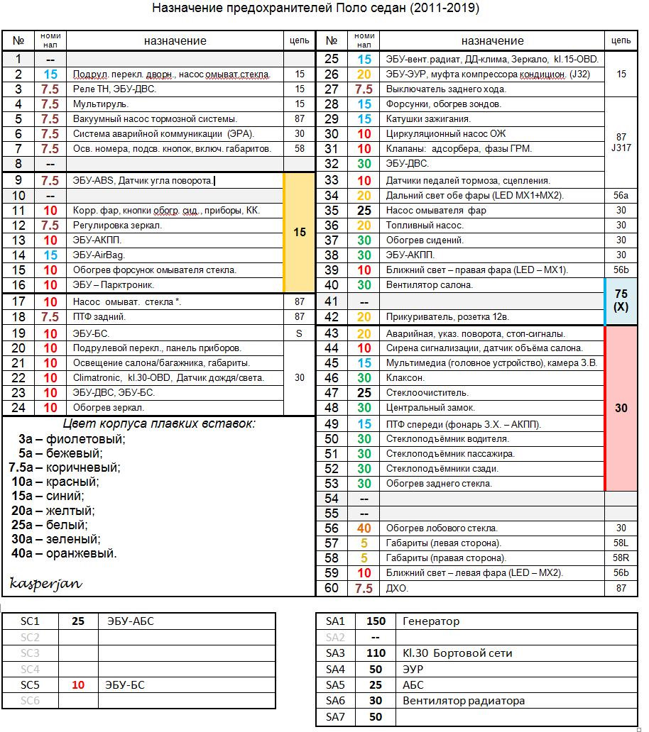 Сам был в поиске такой информации, однако нигде не нашел… Пришлось разобраться, результат смотрите. Есть картинка, распечатав которую, можно сделать наклейку на крышку отсека с предохранителями, чтобы было "как у людей" ;))) Данные в табличке актуальны для "Поло седан" любого года выпуска. Отсутствие каких-либо позиций может быть обусловлено комплектацией конкретного автомобиля и годом выпуска.