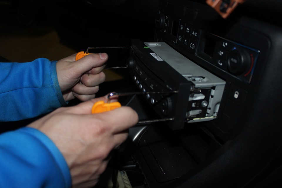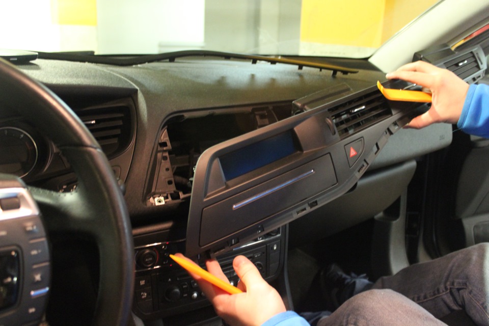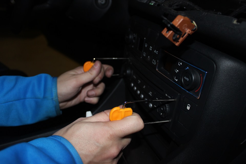 Следующим этапом вытаскиваем магнитолу. Для этого берем специальный инструмент из китайского набора, во французском его нет. Если инструмента нет, то берем 4 шестигранника, вставляем их в монтажные отверстия и в раскачку достаем. С инструментом крепеж легко отщелкивается!