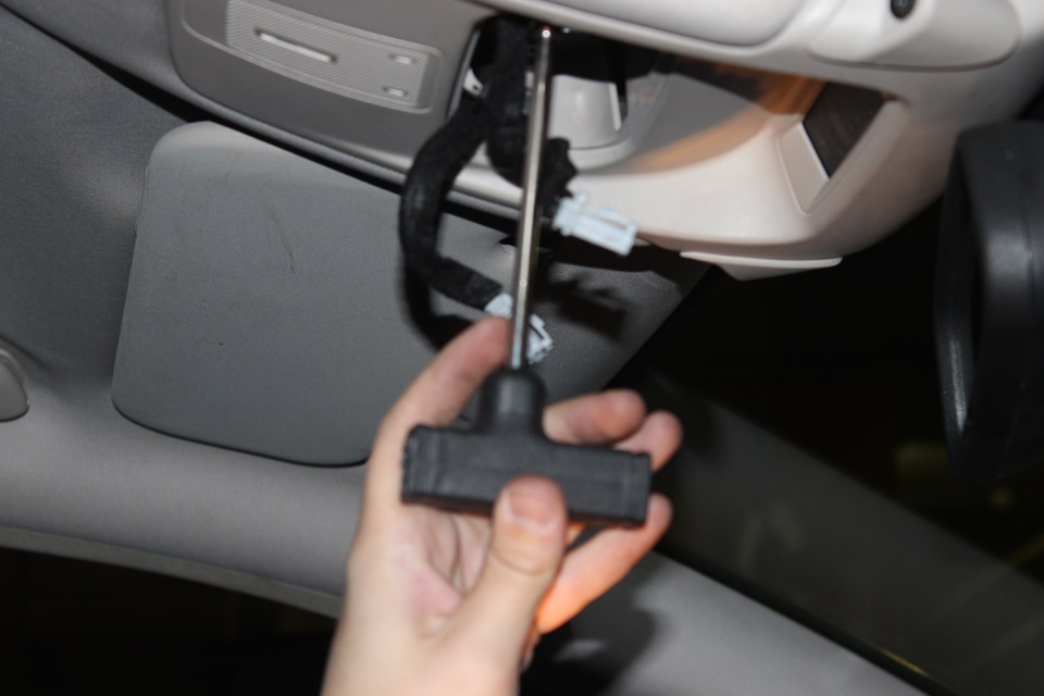 Данная операция необходима для установки микрофона в штатное место. Микрофон мы установили, но не подключили — не получилось закрепить провод к магнитоле, его нужно облудить, тогда он закрепится как надо! После этой операции нужно будет снова все разобрать и подключить микрофон, о чем отпишусь отдельно. Не повторяйте мою ошибку, облудите провод сразу!