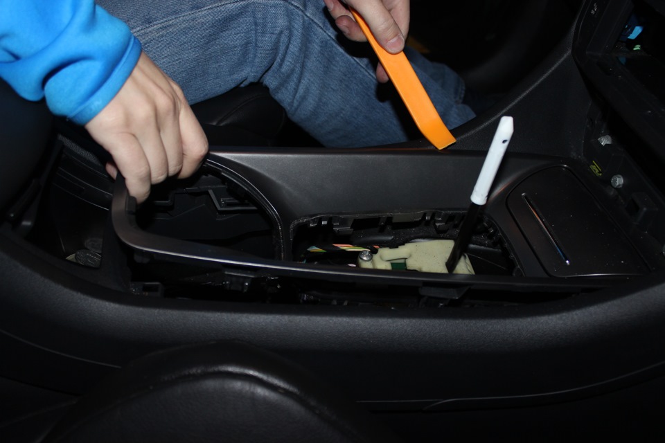 Следующий по очереди — пластик центрального тоннеля. Под ним должен проходить шнур USB, для вывода в подлокотник, но не в нашем случае, ибо шнур оказался коротким, в итоге USB вывели в бордачек, в рабочее отверстие. Но пластик сняли не зря, я его проклеил антискрипом.