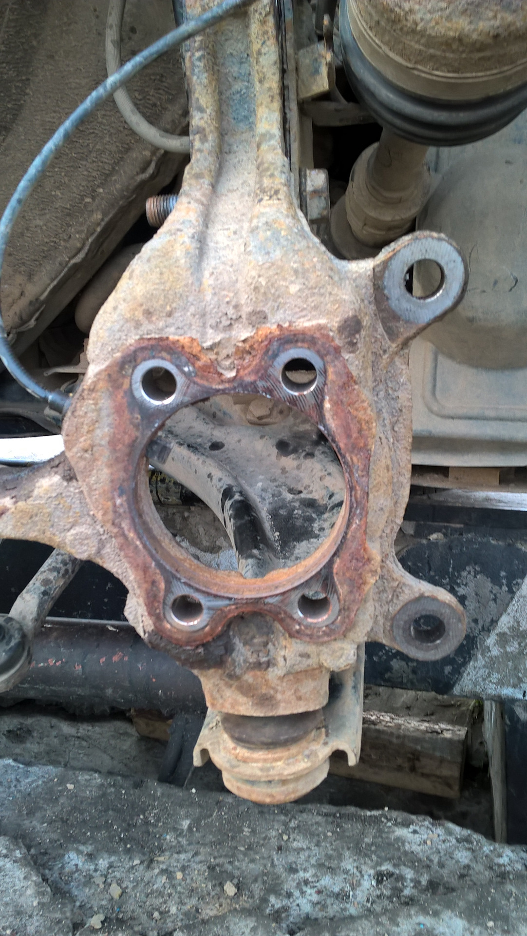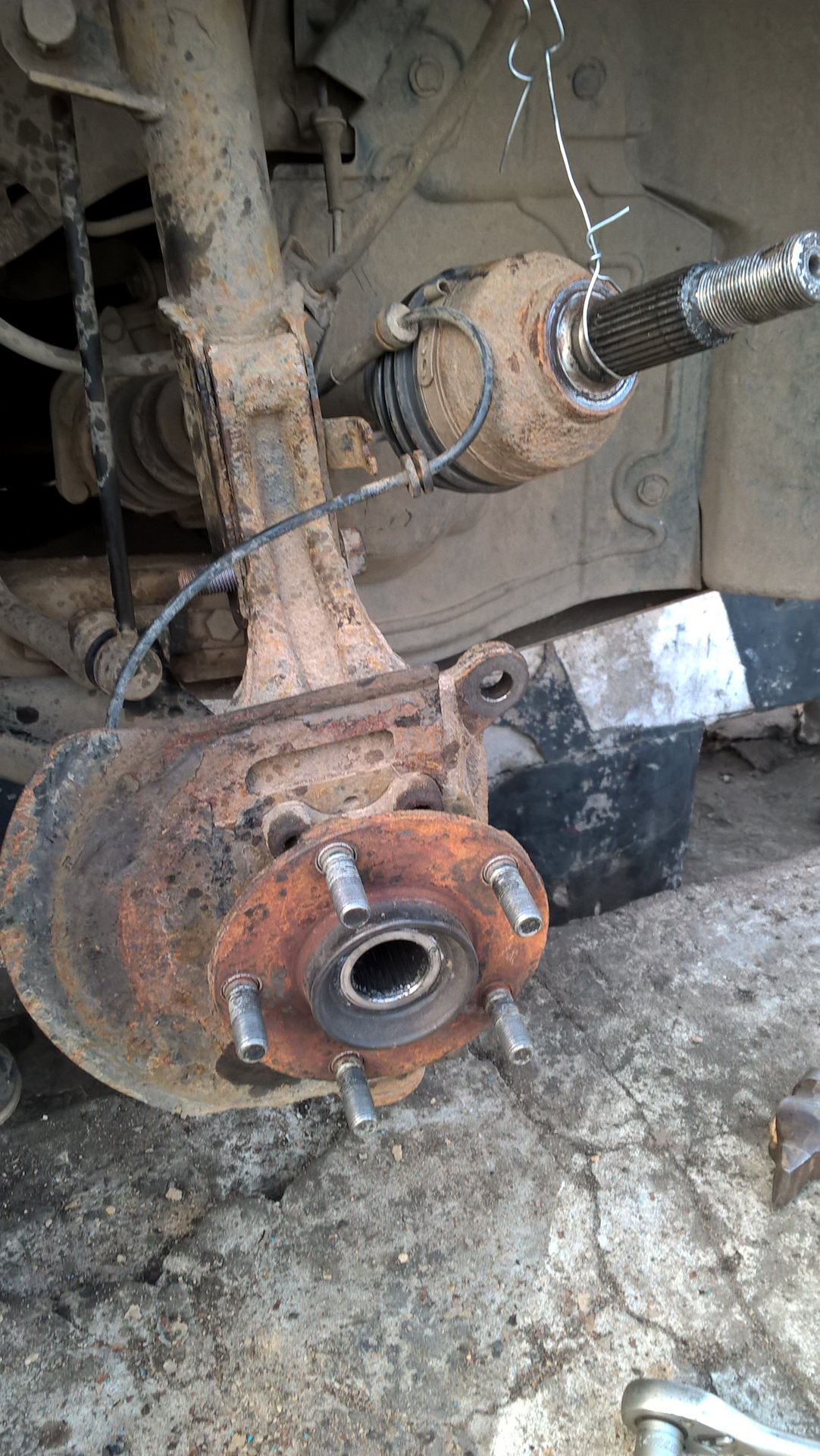 Все шло в штатном режиме. Единственный нюанс. При демонтаже ступицы, чтобы не повредить датчик ABS, начал я отгибать защитное кольцо, как советовал DeviLav, а оно у меня снялось полностью. Ну снялось и снялось. Выбить ступицу не мешает и не цепляет датчик ABS. Старая ступица вышла без проблем.