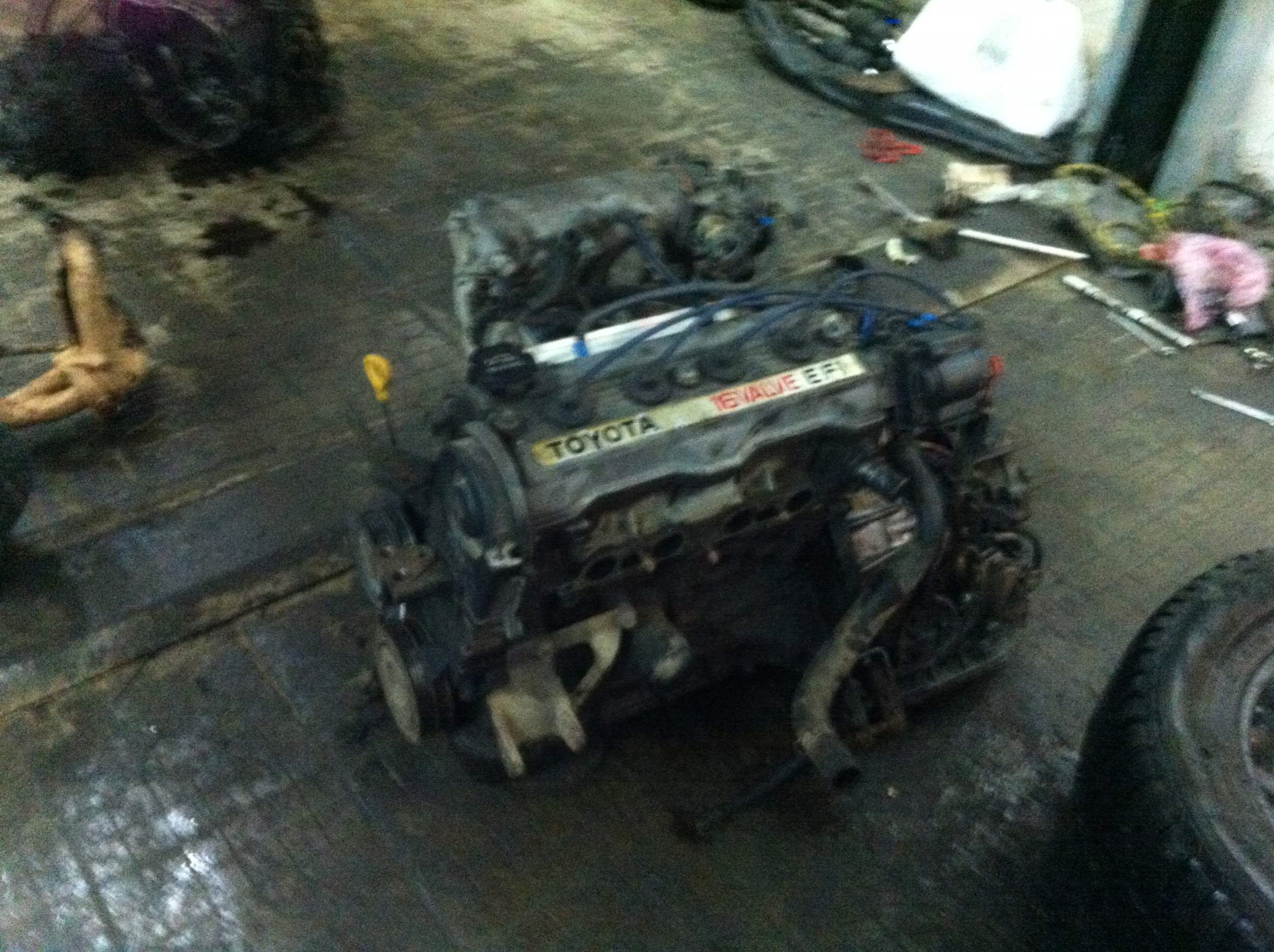 ( утра, выгружаем из салона коробку, запчасти, и начинаем. Сначала хотел скинуть только коробку, но несколько часов бился над вопросом, почему она не отваливается от двигателя. вроде все болты открутил. Оказалось что среди мазута не заметил один болт на кронштейне крепления раздатки, которого небыло на свежей коробке. Но заметил уже после того, как решил скинуть всё вместе, с мотором )))