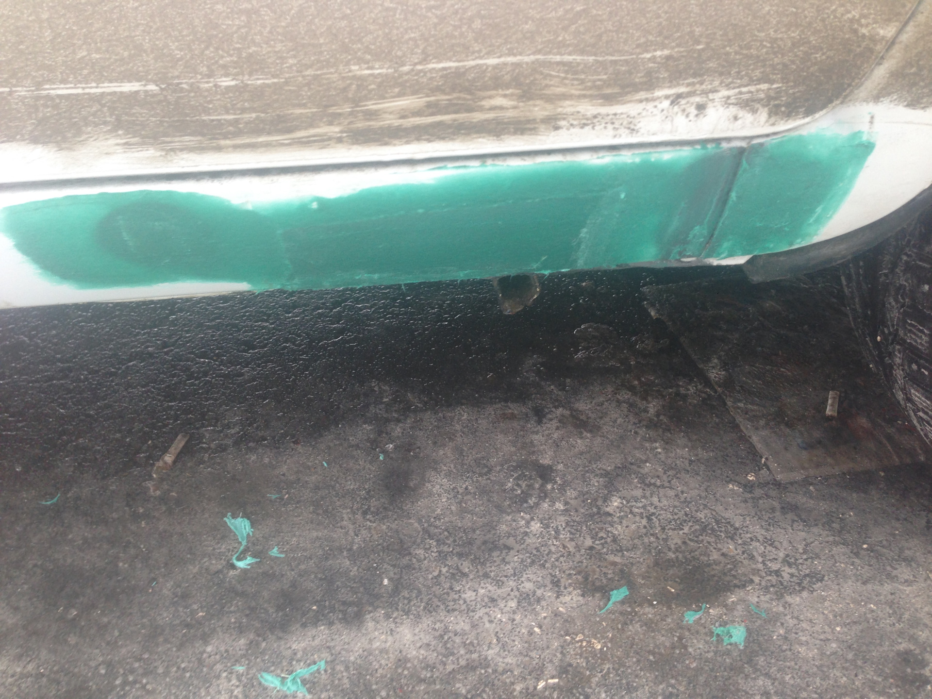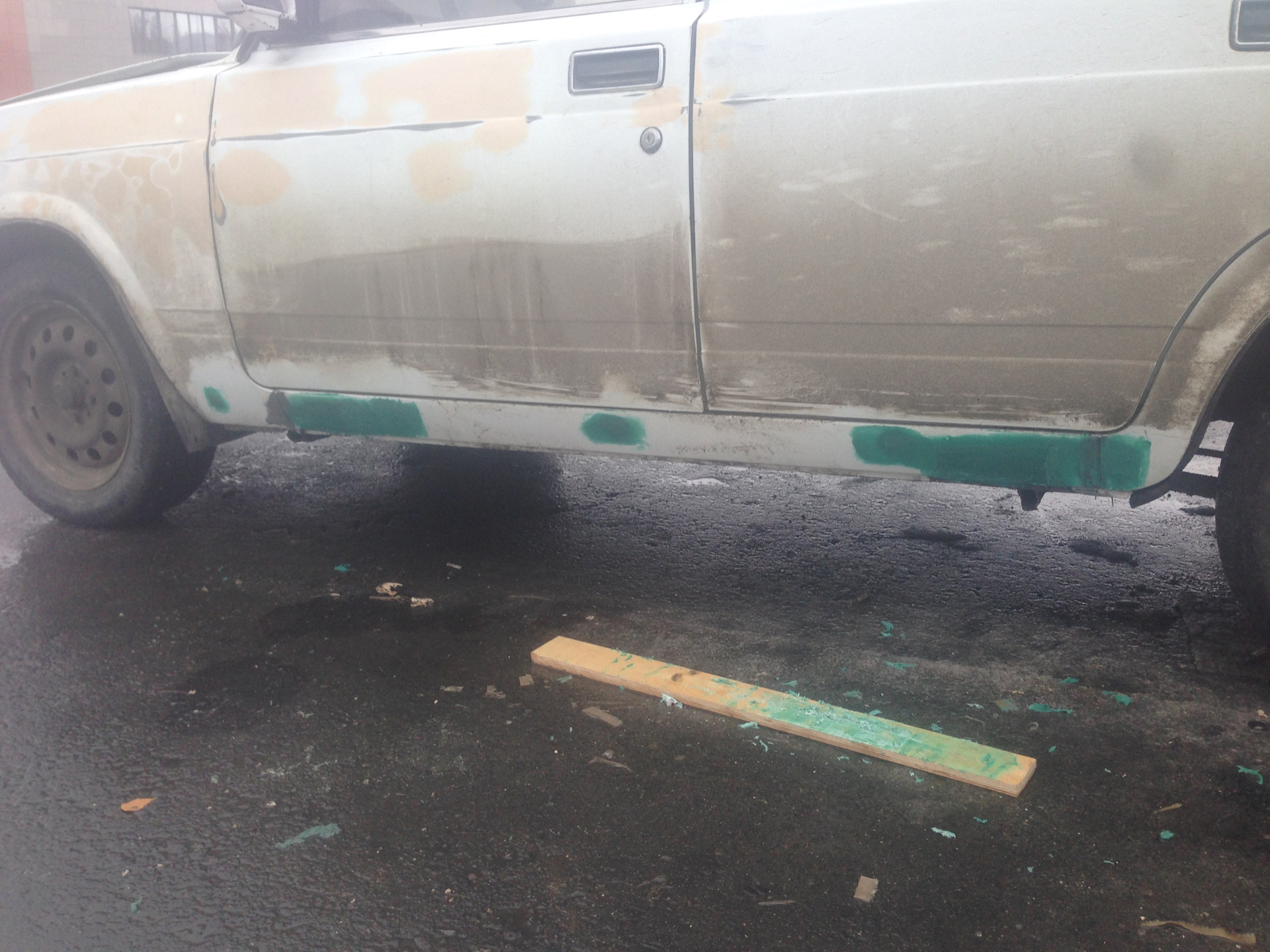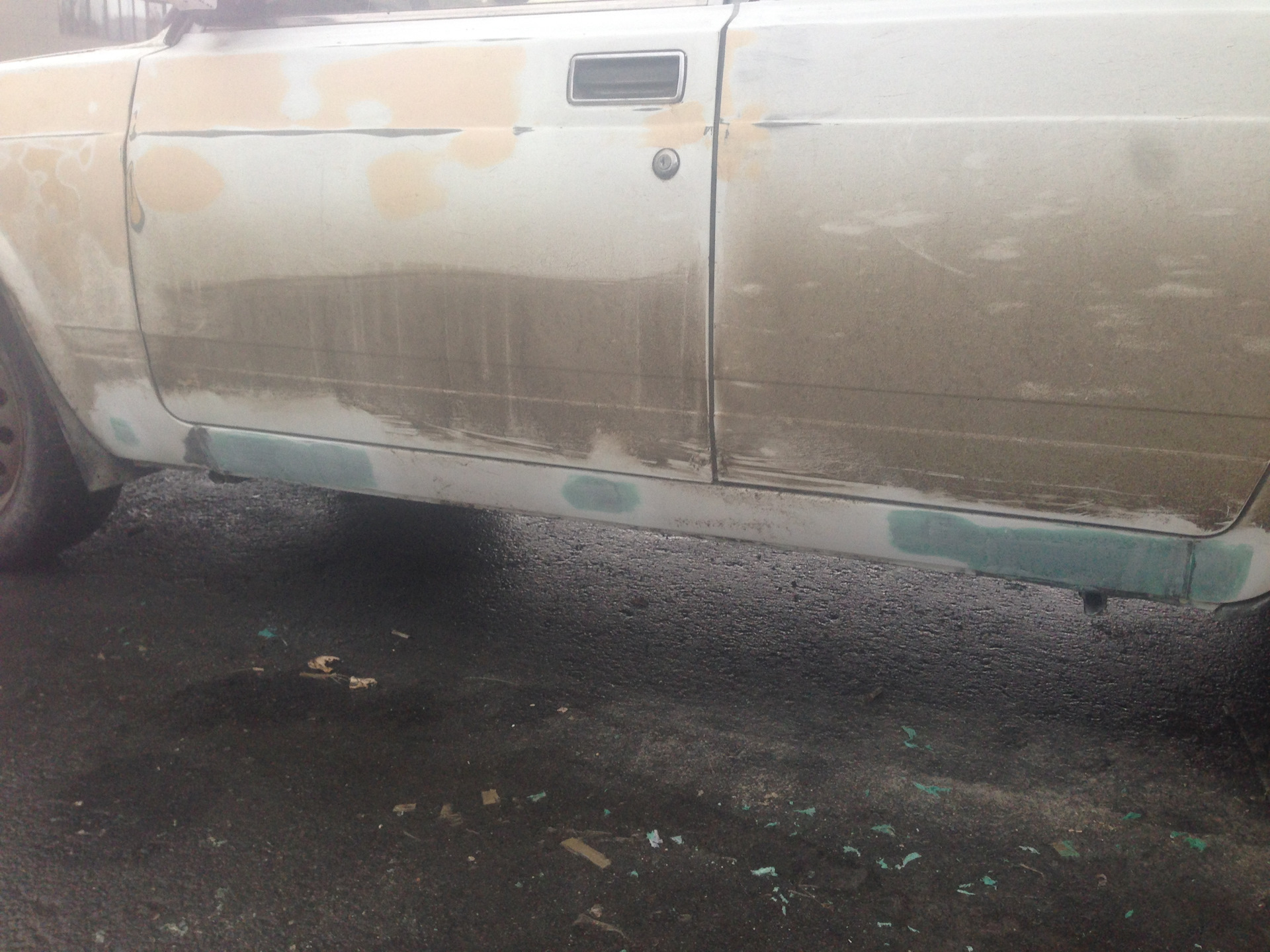 Ну так как я машину готовил к покраске я решил их тоже подремонтировать, хотел переварить, но загнули мне за два порога за работу 10.000 и чот нифига цена не порадовала… В общем не ломая головы, взял шпаклевку со стекловолокном, и обычную стеклоткань, которой теплотрассы обматывают:)) конечно можно использовать эпоксидный клей или смола не знаю как правильно, но я решил сделать так)