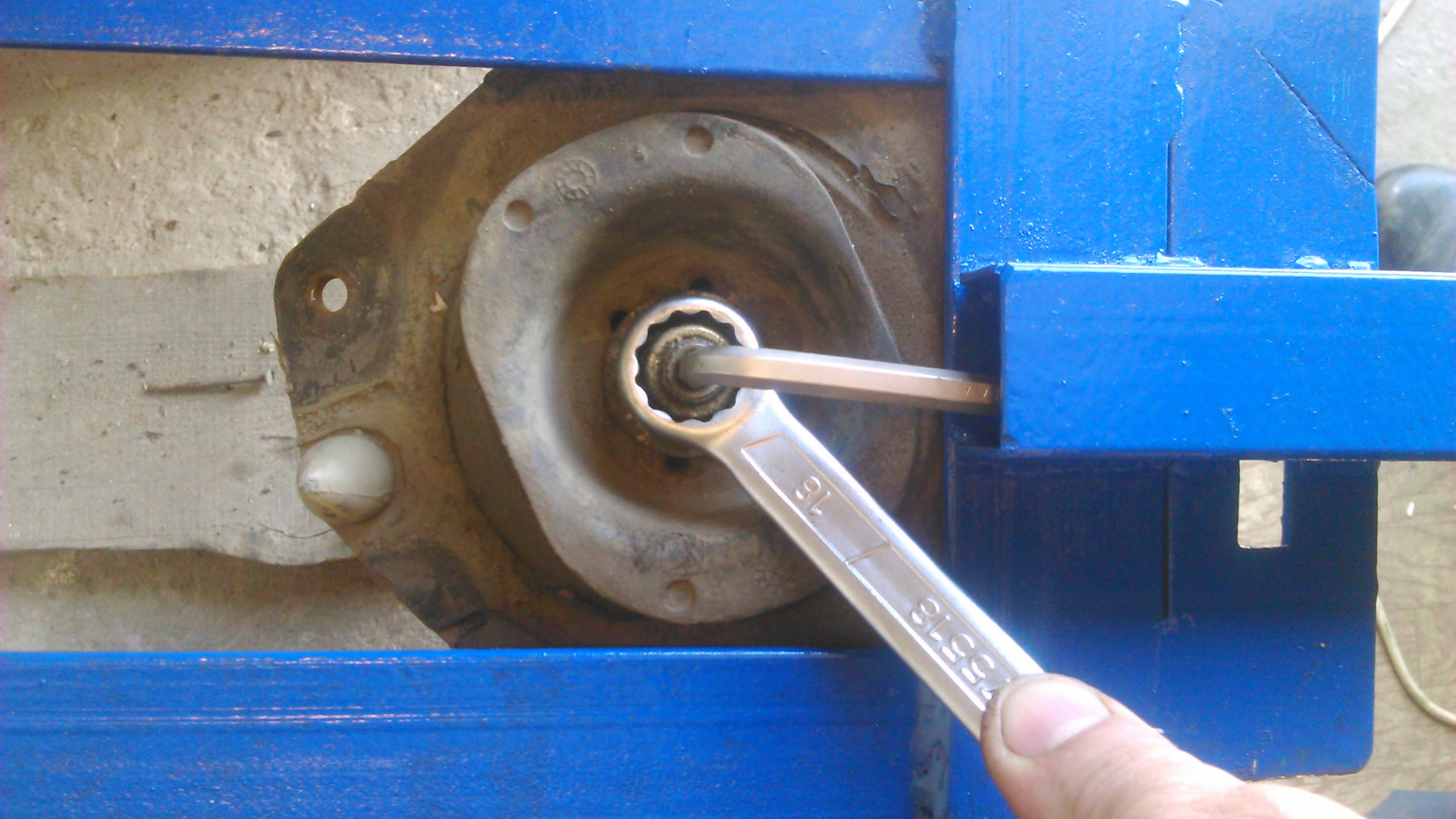 Пришлось сына звать. Он давил на удлинитель, я на шток ремень кожаный накинул и шток направлял в отверстие опоры.