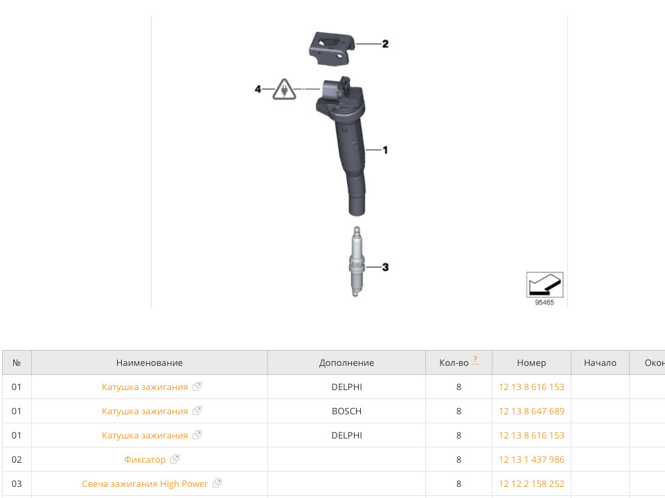 Остаётся вопрос, какие же всё-таки катушки должны идти на N62? Тут имеет смысл ориентироваться на применимость свечей, в которой никаких N63 не упоминается по понятным причинам. Нет там также и моторов N5x. А вот из катушек для моторов N46 подходят всё те же DELPHI 12 13 8 616 153, что и на N62, плюс ELDOR 12 13 8 657 273. Что DELPHI, что ELDOR, они также указаны в применимости к моторам N54, N55 и N63 с тонкими свечами. Свечи разные, а катушки типа универсальные?