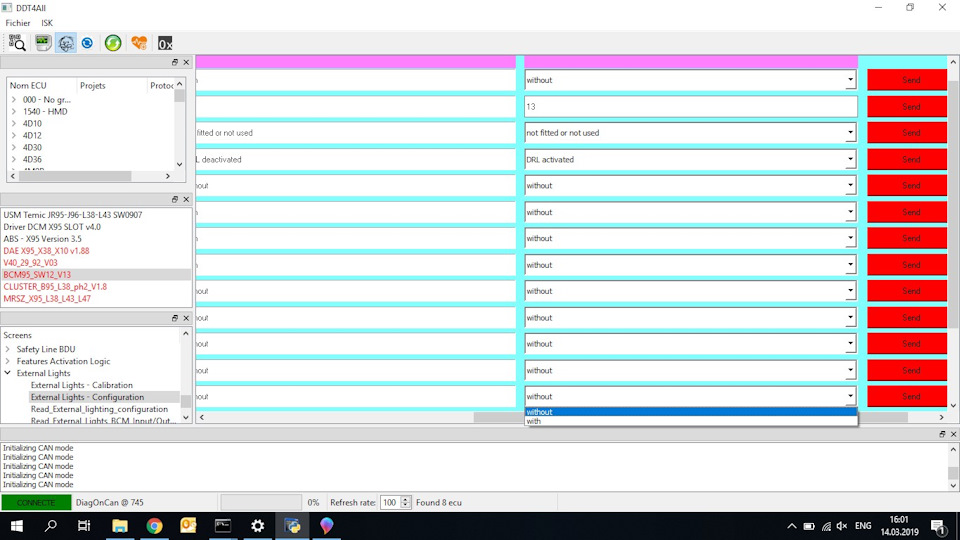 Да есть лампочки. В тесте приборки можно же посмотреть. В том же DDT4ALL, в том же блоке, Commands -> Allume. Но мне сдается команду на их зажигание дает блок впрыска. А в нем такой опции я не нашел.