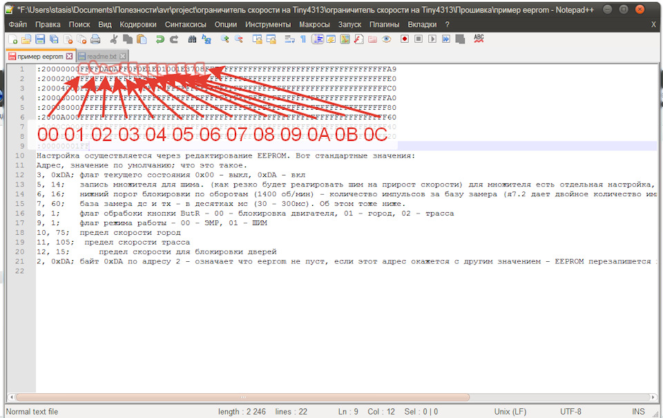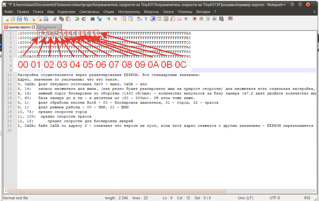 Добрый. ну, я меняю в обычном блокноте. через программу которой заливаю прошивку (avrdudess) скачиваю с кристалла eeprom в формате hex, открываю в штатном блокноте или, мне больше нравится notepad++, и редактирую hex код. сохраняю и заливаю обратно. важно! вот пример одной строки :20000000FFFFDADAFF0F0E1E01001E3708FFFFFFFFFFFFFFFFFFFFFFFFFFFFFFFFFFFFFFA9, тут последние 2 символа (A9) — это контрольная сумма, при редактировании строки она должна меняться. но мне лень было искать алгоритм, как она высчитывается. поэтому я делаю так: редактирую, сохраняю. пытаюсь залить готовый eeprom через avrdudess, получаю ошибку что не совпадает контрольная сумма. текст ошибки примерно такой: "ахтунг! чексум ис бэд! у тебя A9, а должно быть C5" меняю в eeprom A9 на C5 и заливаю.