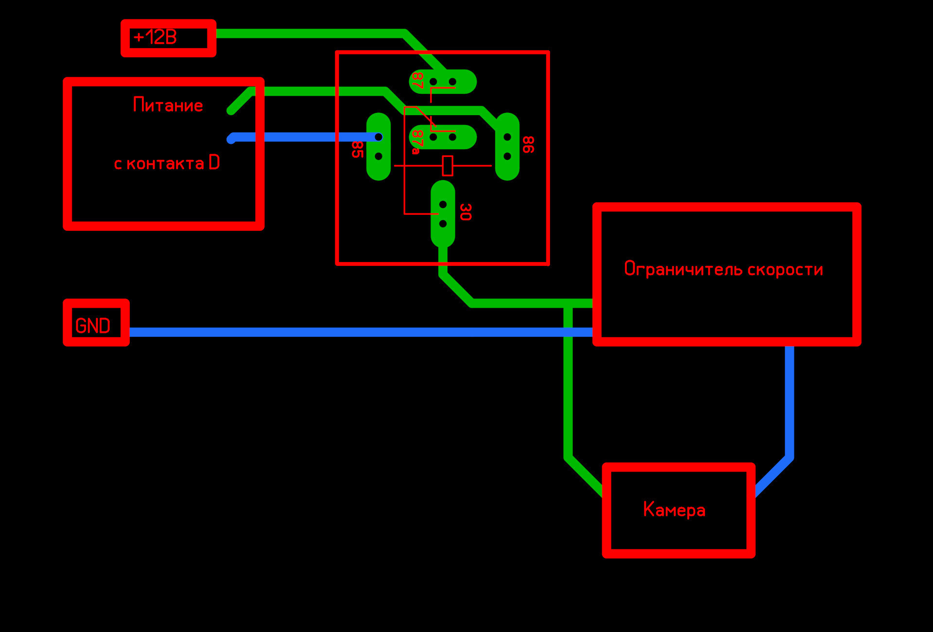 GND это масса. то есть плюс к камере подключается постоянно, а минус идет через ограничитель скорости, который будет подавать его или нет от датчика скорости