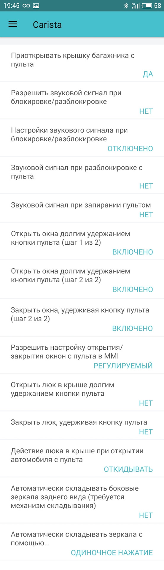 Я не активировал все функции. Из тех что что в каристе есть, у меня многое уже активировано. так было с завода. Мне по идее нужно было 4 мигания, которые я успешно активировал и еще не активировал выключение дхо при ручнике. Все остальное мне или не нужно или есть. также я списался с производителем этой проги и сейчас веду с ним диалог. Они обещали добавить в настройки вторую потивотуманку -кто-то подкидывал эту идею, я ее им переадресовал. Журнал по этой теме общения с ними чуть позже дополню.