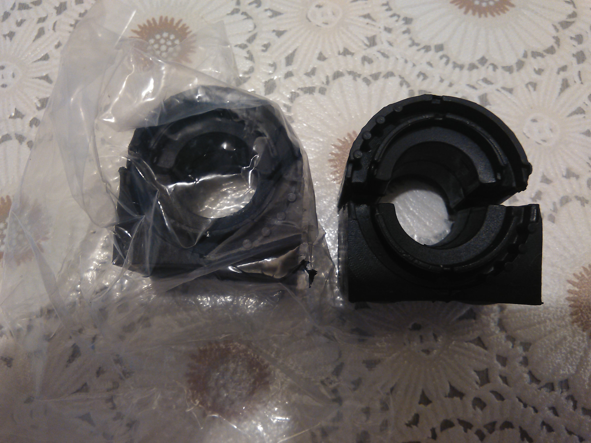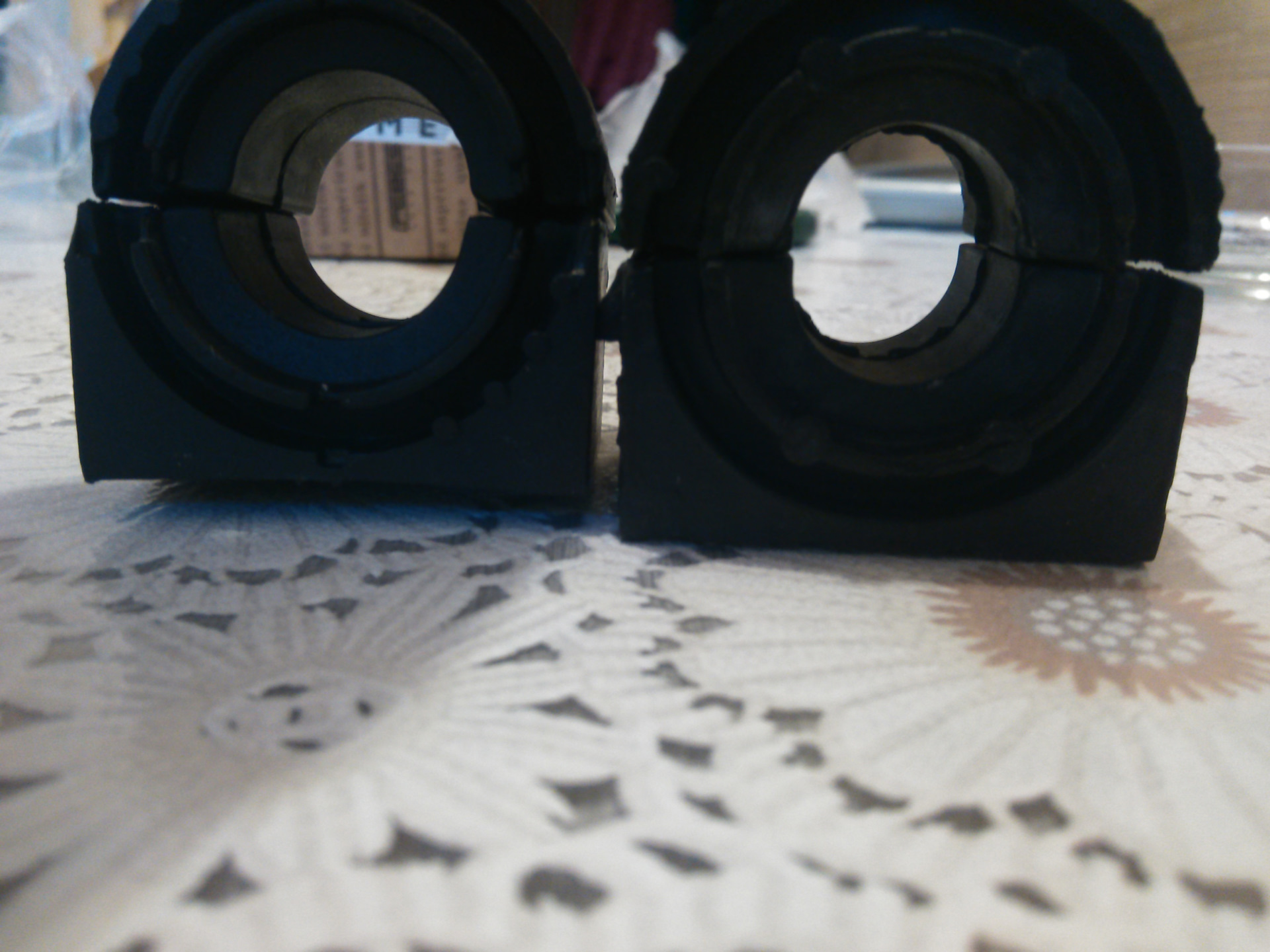 в этот раз замена была на много проще, стаб не снимал. сняли крышку подрамника, ослабили болты стаба, вытащили полиуретан, спилили их, так как они цельные, и на место вставили 2 половинки новых. затянули на место болты стаба. Резинки встали отлично!:)